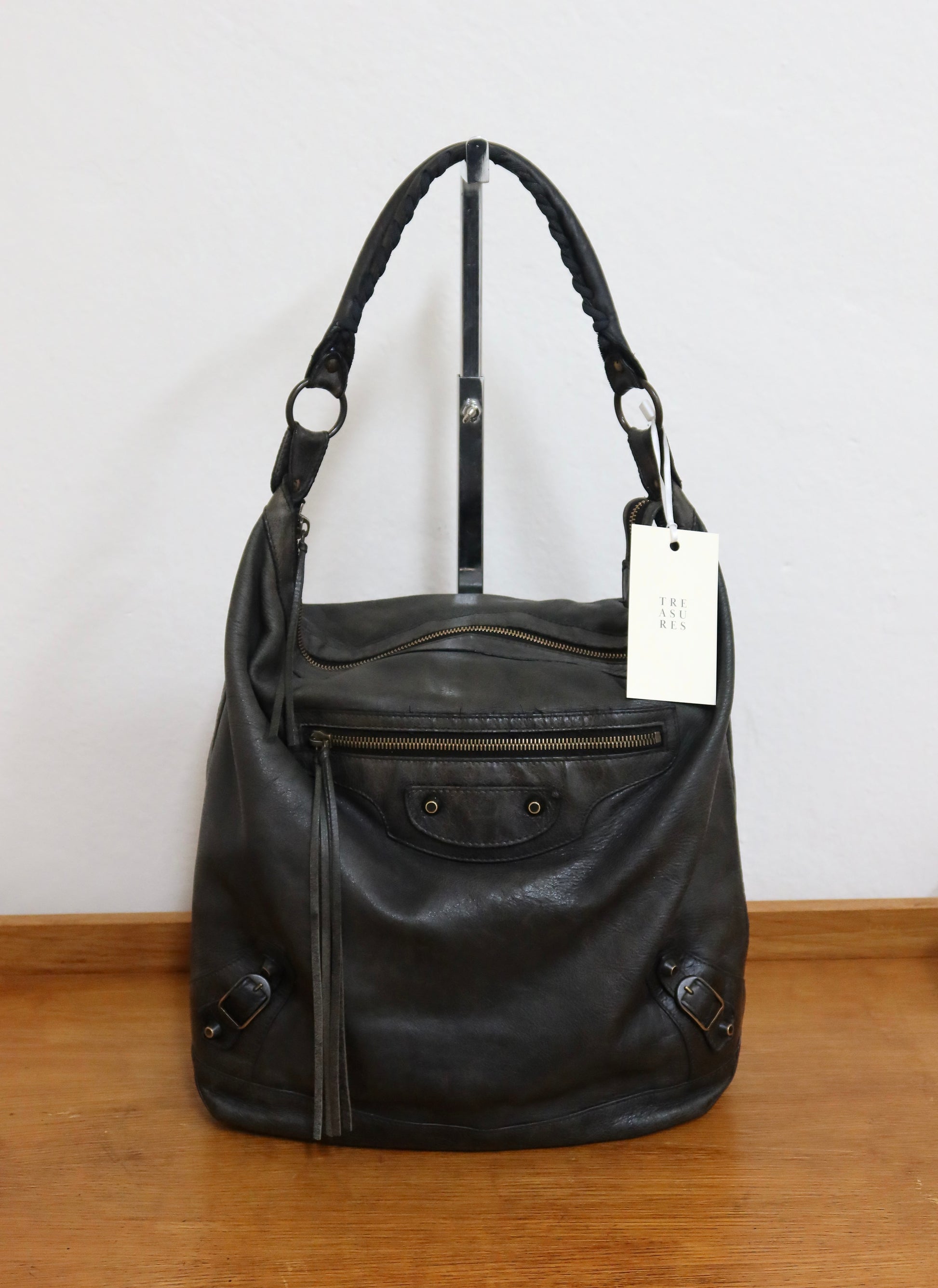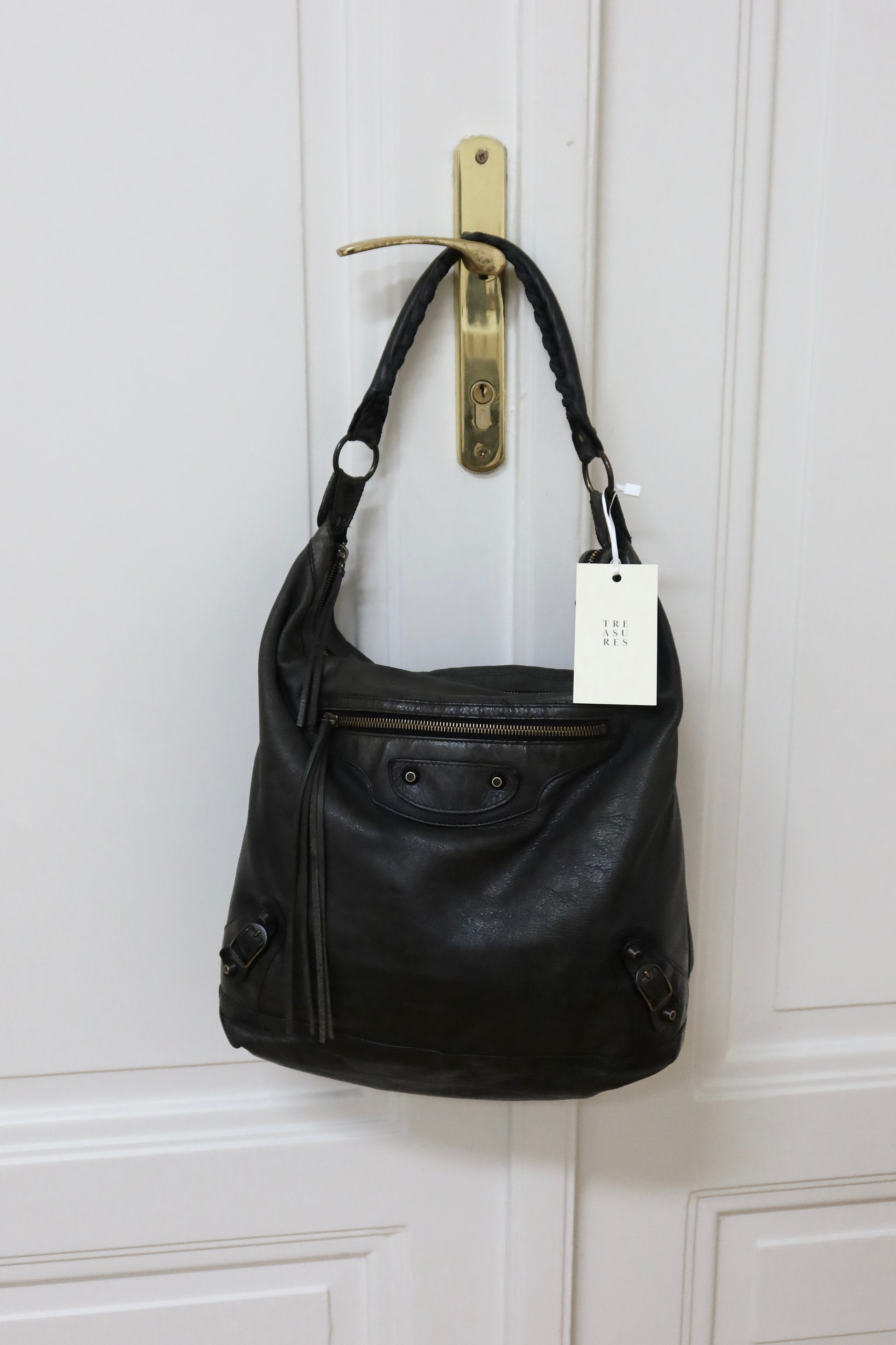 Balenciaga shoulder bag v tmavě šedém odstínu. Ideální velikost pro každodenní nošení. Lehká, pohodlná na rameni a s tvarem, který se přirozeně přizpůsobí obsahu. Díky tomu pojme všechny nezbytnosti na celý den.