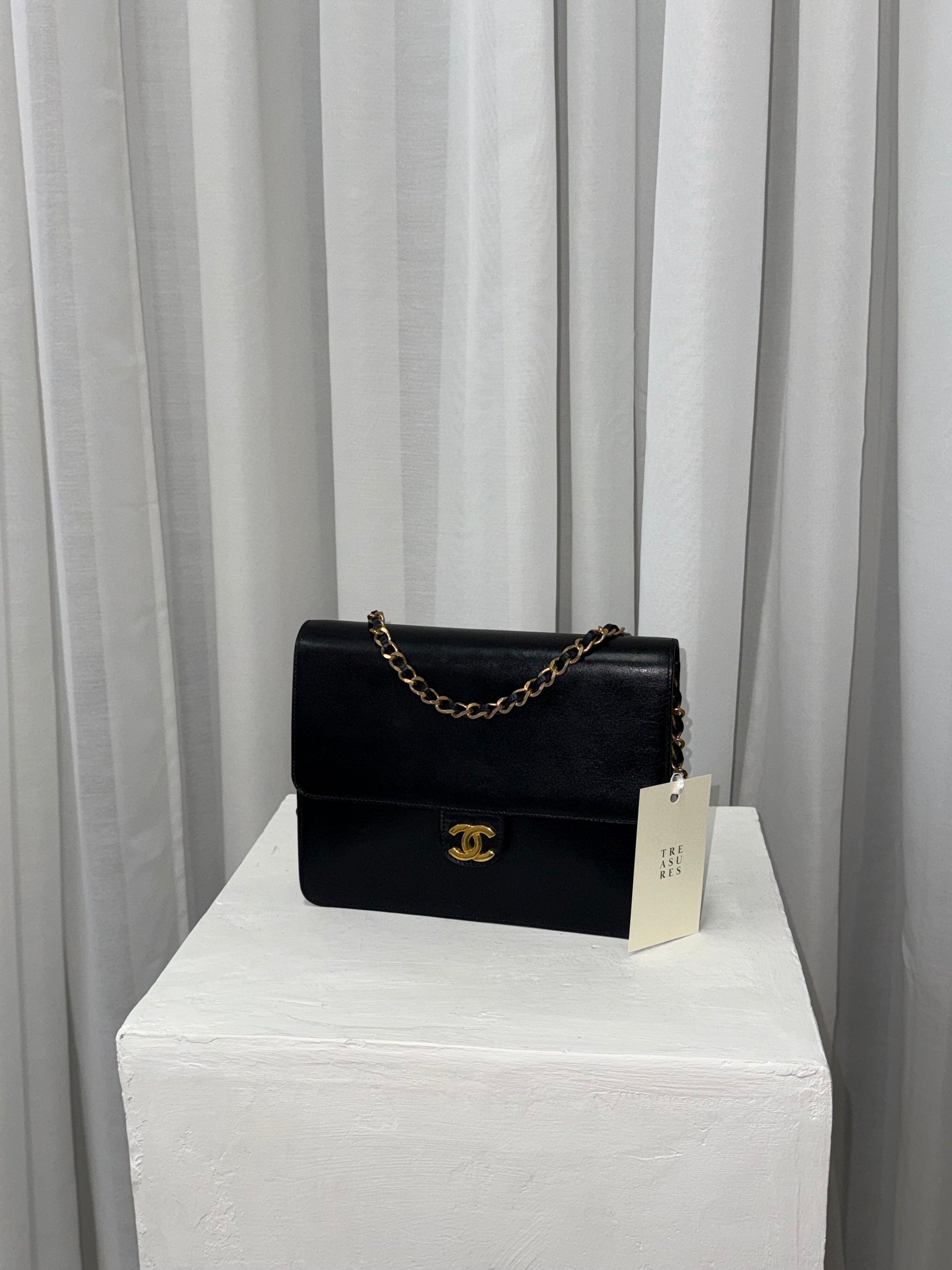 Chanel flap bag z hladké box telecí kůže v černé barvě s 24k pozlacením z 80. let.