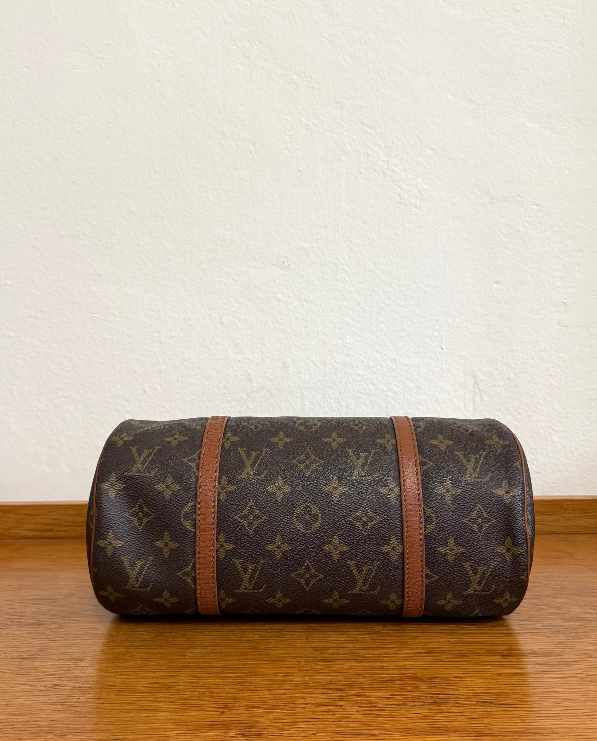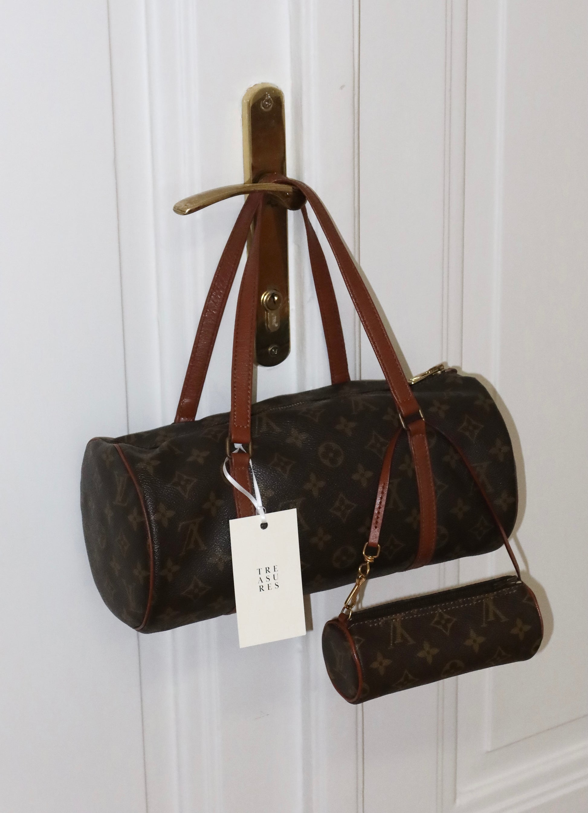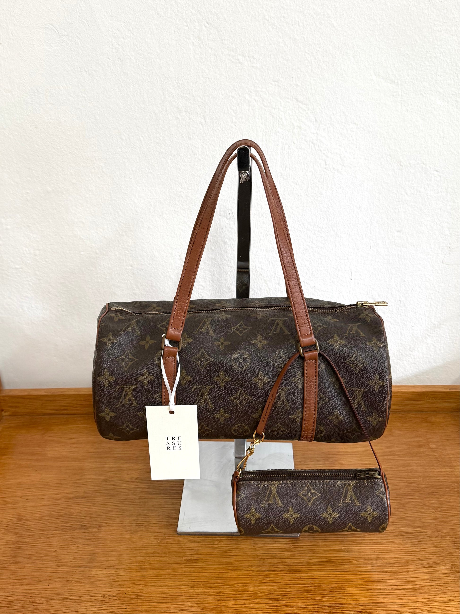 Elegantní vintage set Louis Vuitton Papillon, který zahrnuje ikonickou kabelku Papillon 30 a mini Papillon pouch. Vyrobeno z odolného monogram canvasu s prvky z přírodní vachetta kůže. Nadčasový model, který vyniká svým jedinečným válcovitým tvarem – symbol vintage elegance Louis Vuitton.