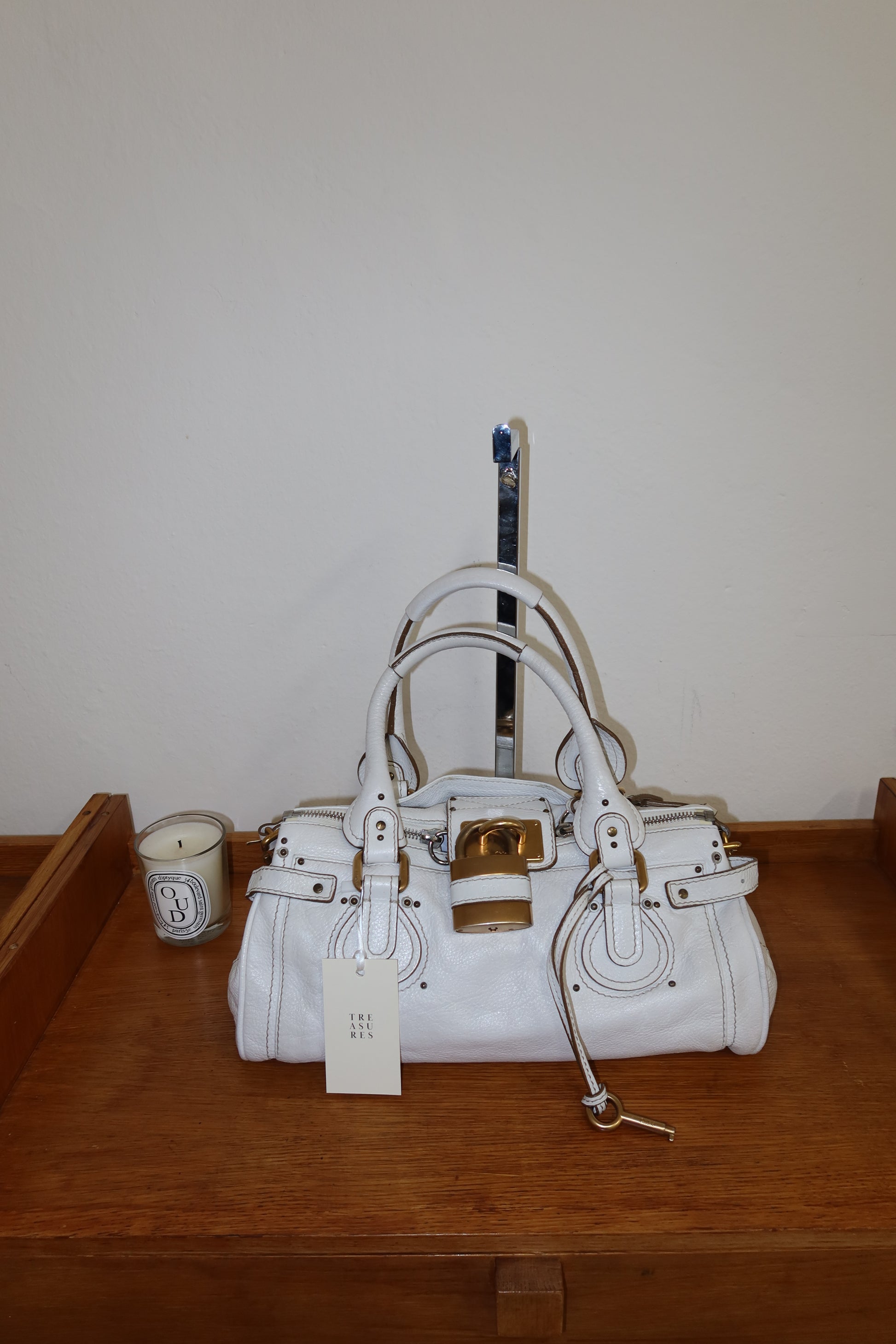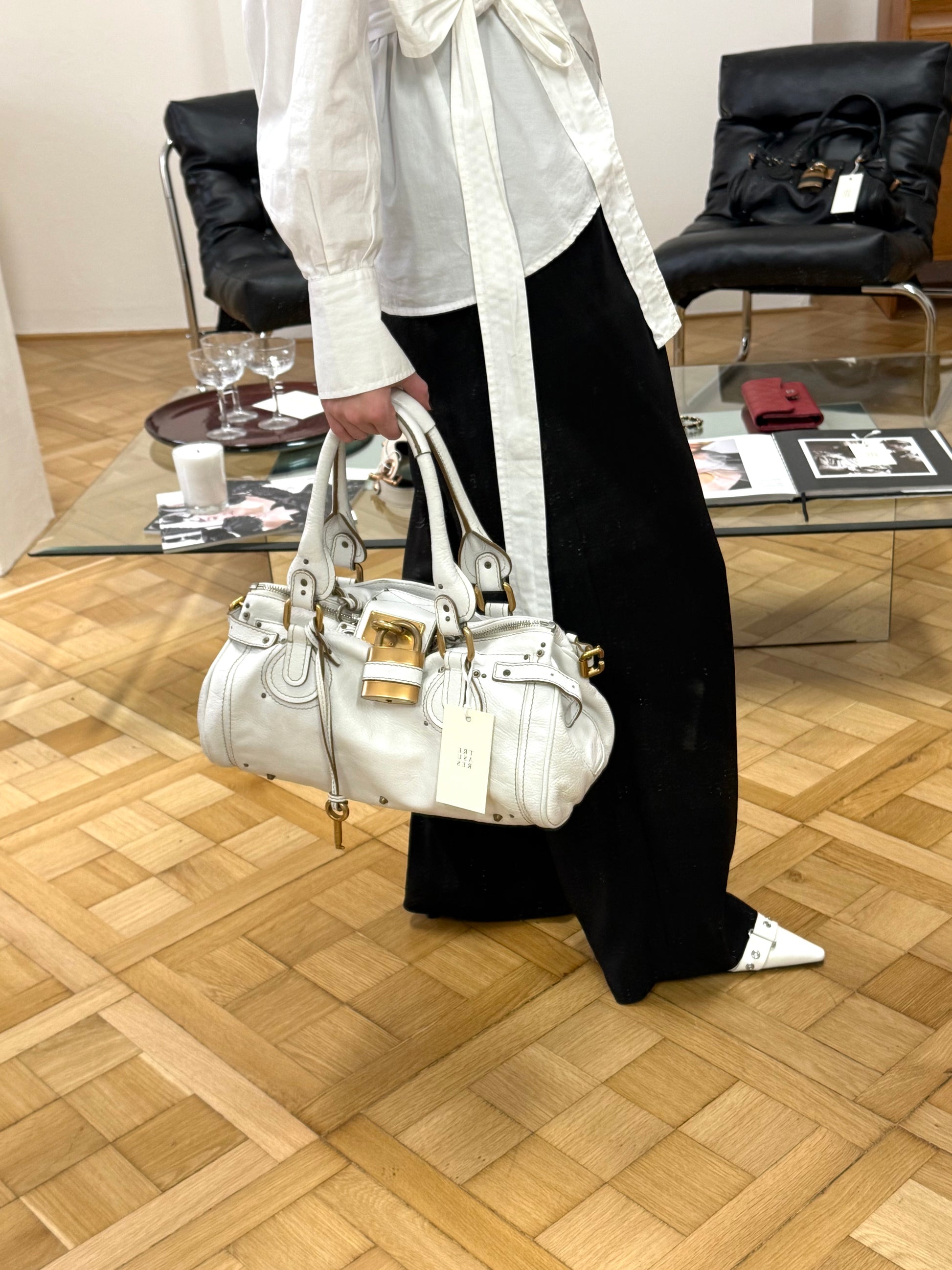 Chloé Paddington bag v bílé barvě z měkké kůže se zlatým hardwarem a charakteristickým masivním visacím zámkem – poznávacím znakem tohoto ikonického modelu.