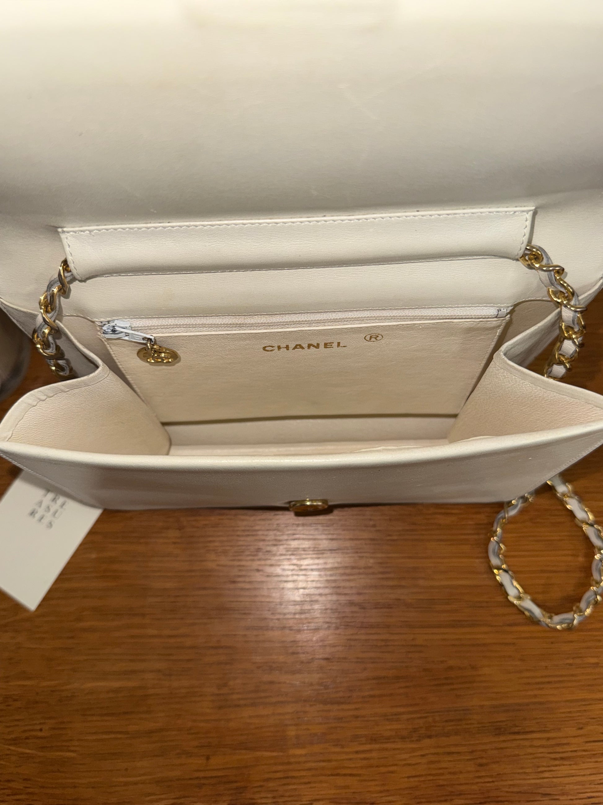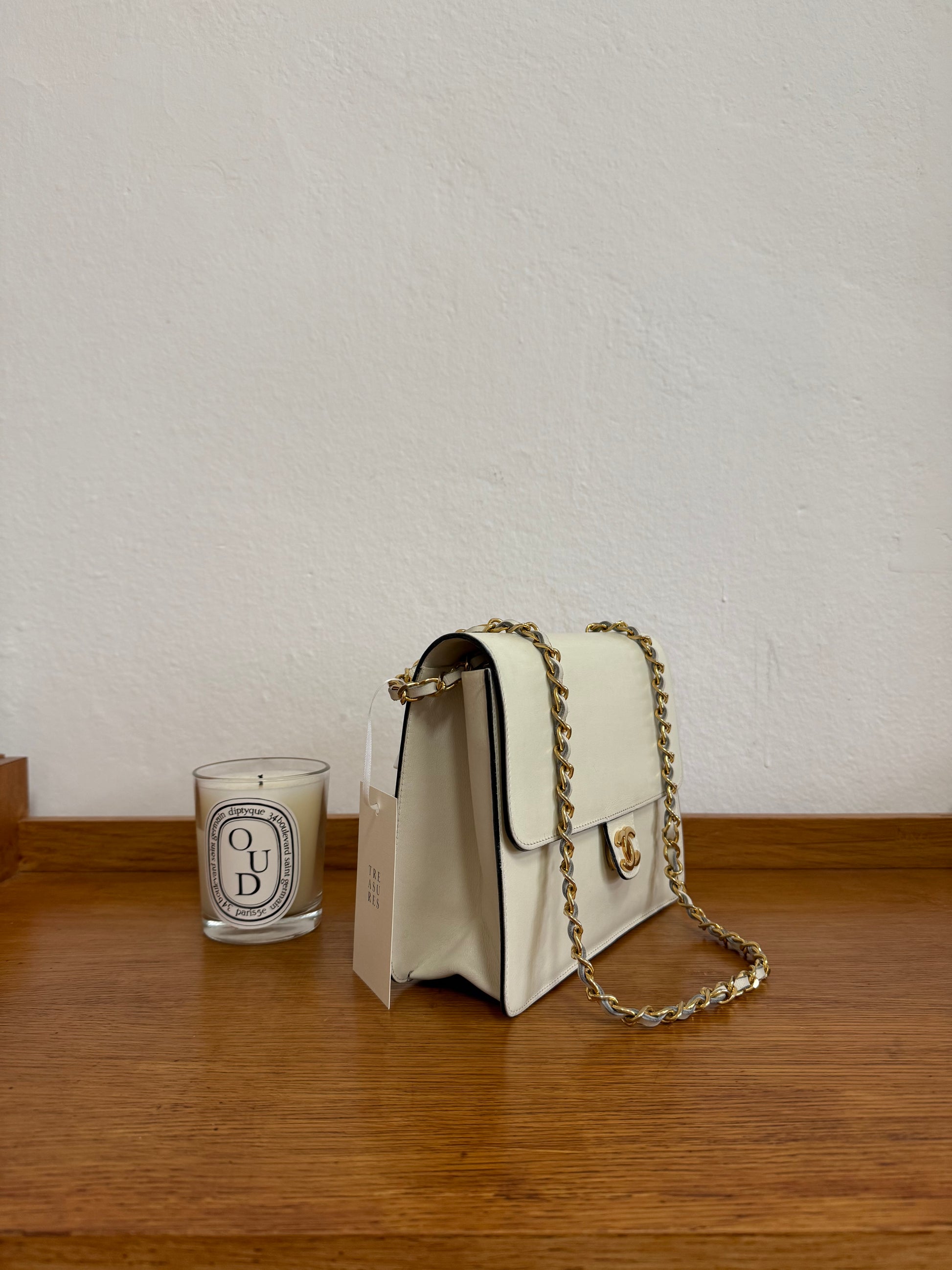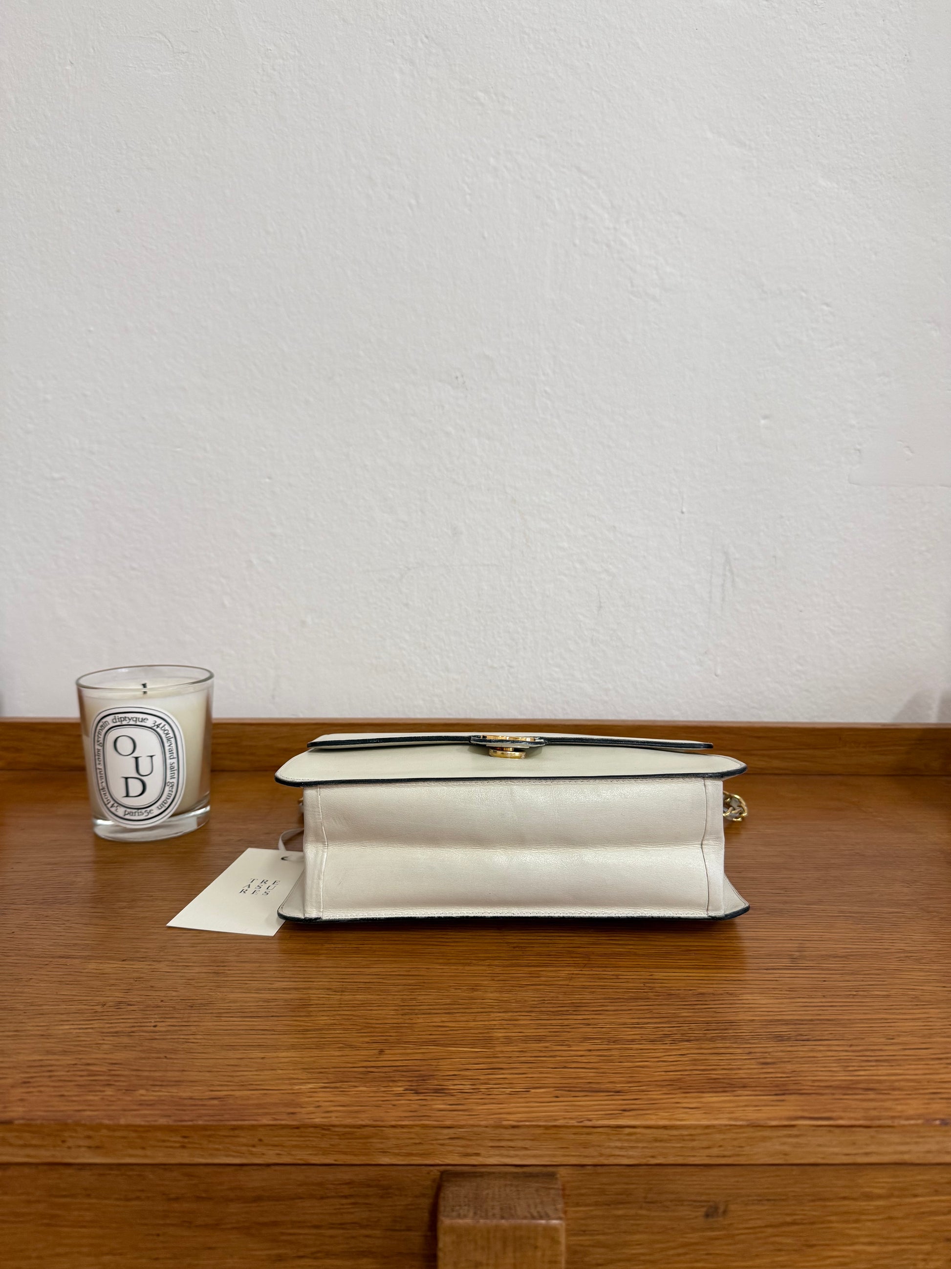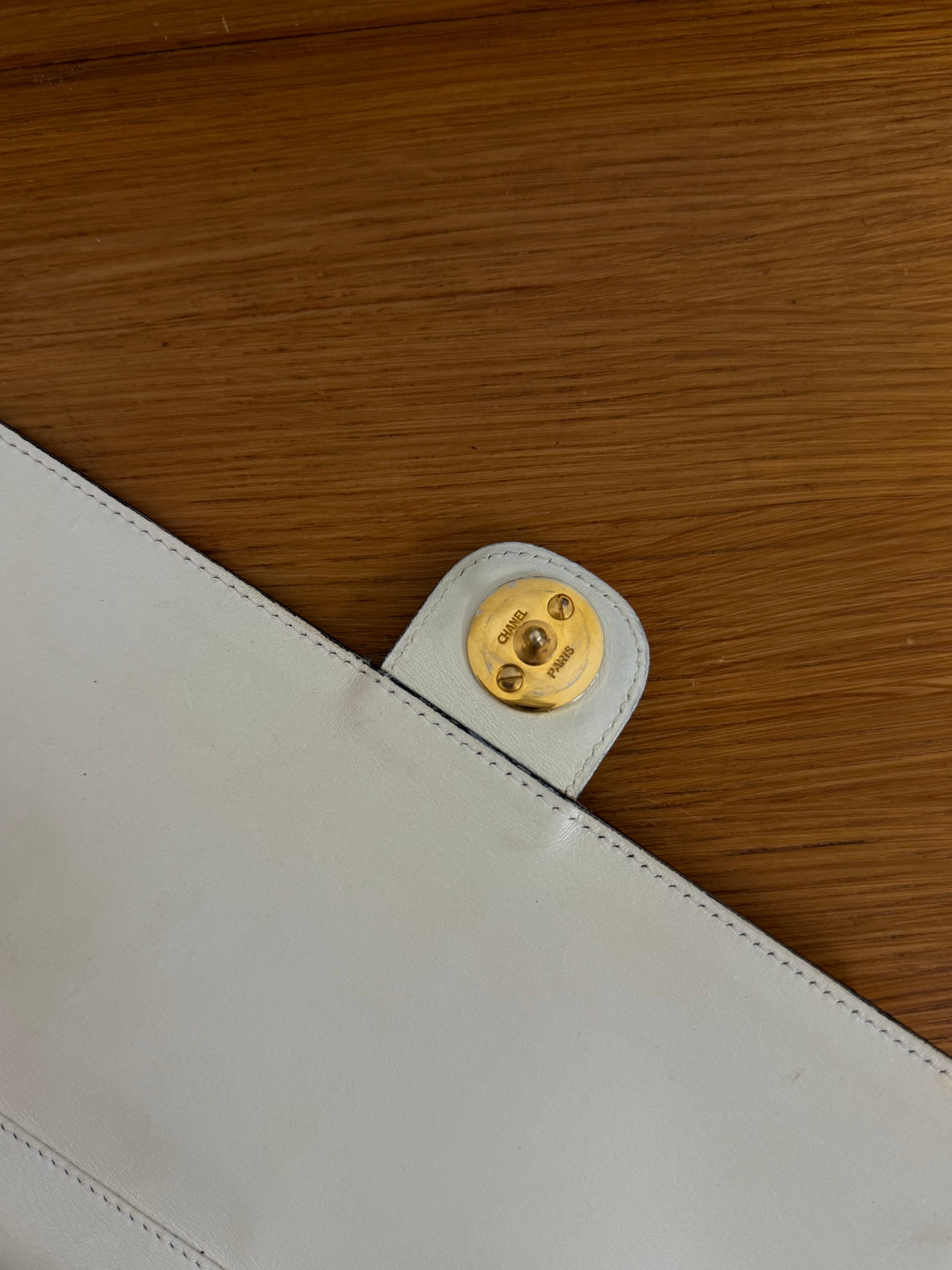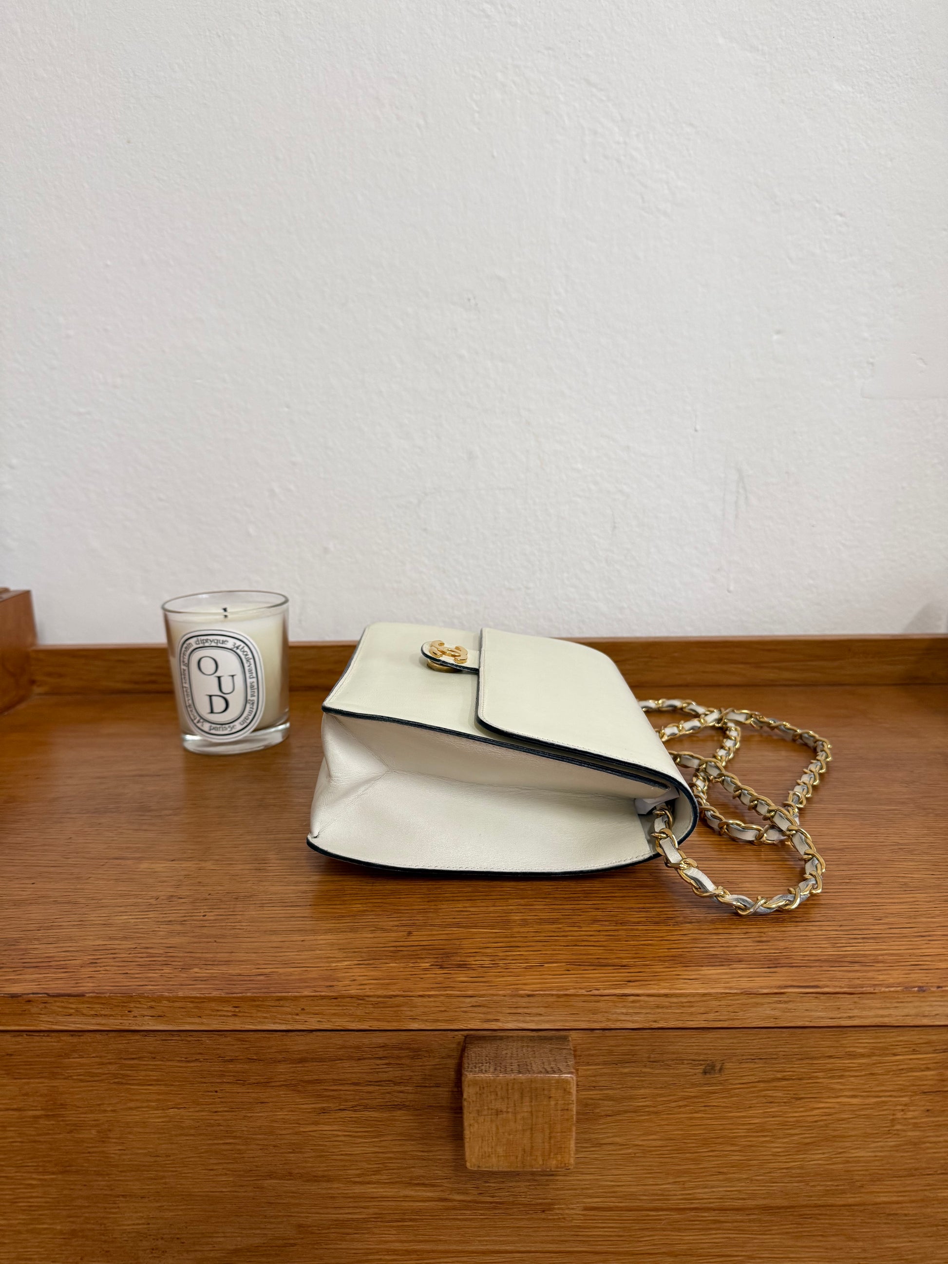 Chanel flap bag z hladké box telecí kůže v jemném krémovém odstínu s 24k pozlacením z 80. let.