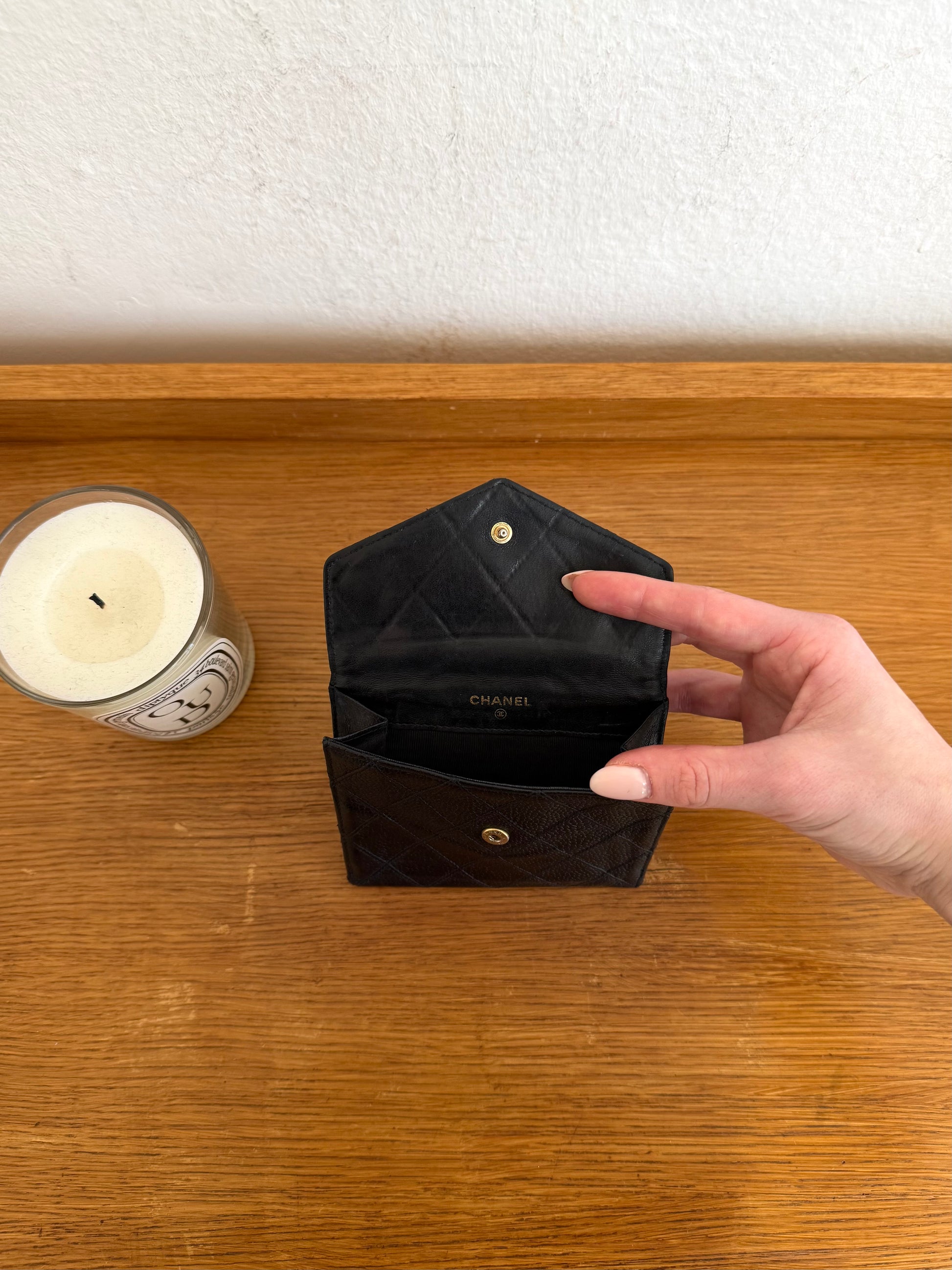 Nádherná Chanel double-sided peněženka z odolné caviar kůže se zlatým hardwarem. Stylový, kompaktní kousek, který lze nosit na řetízku jako elegantní doplněk nebo jako klasickou peněženku do kabelky.