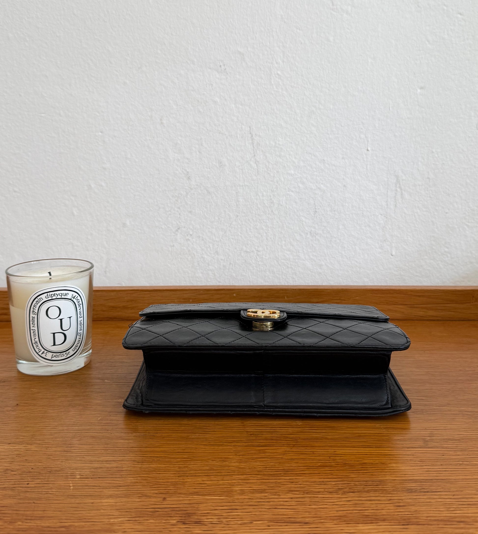 Chanel single flap bag z jemné jehněčí kůže v černé barvě se 24k pozlaceným hardwarem z 80. let. Klasická oblíbená flap silueta s řetízkem a clasp zapínáním. Výjimečně zachovalý kousek v překrásném stavu se všemi původními komponenty potěší i ty nejnáročnější klienty.