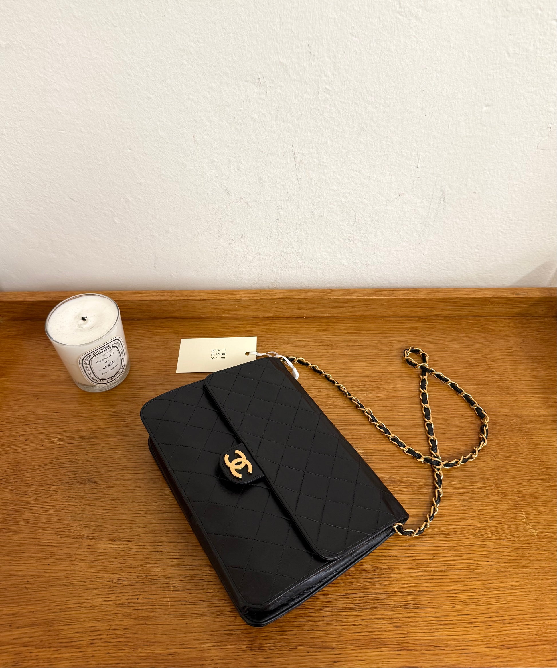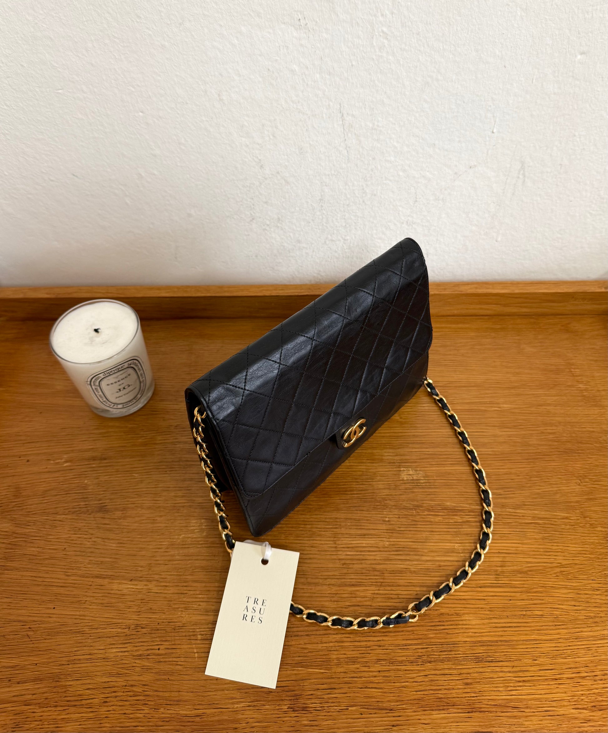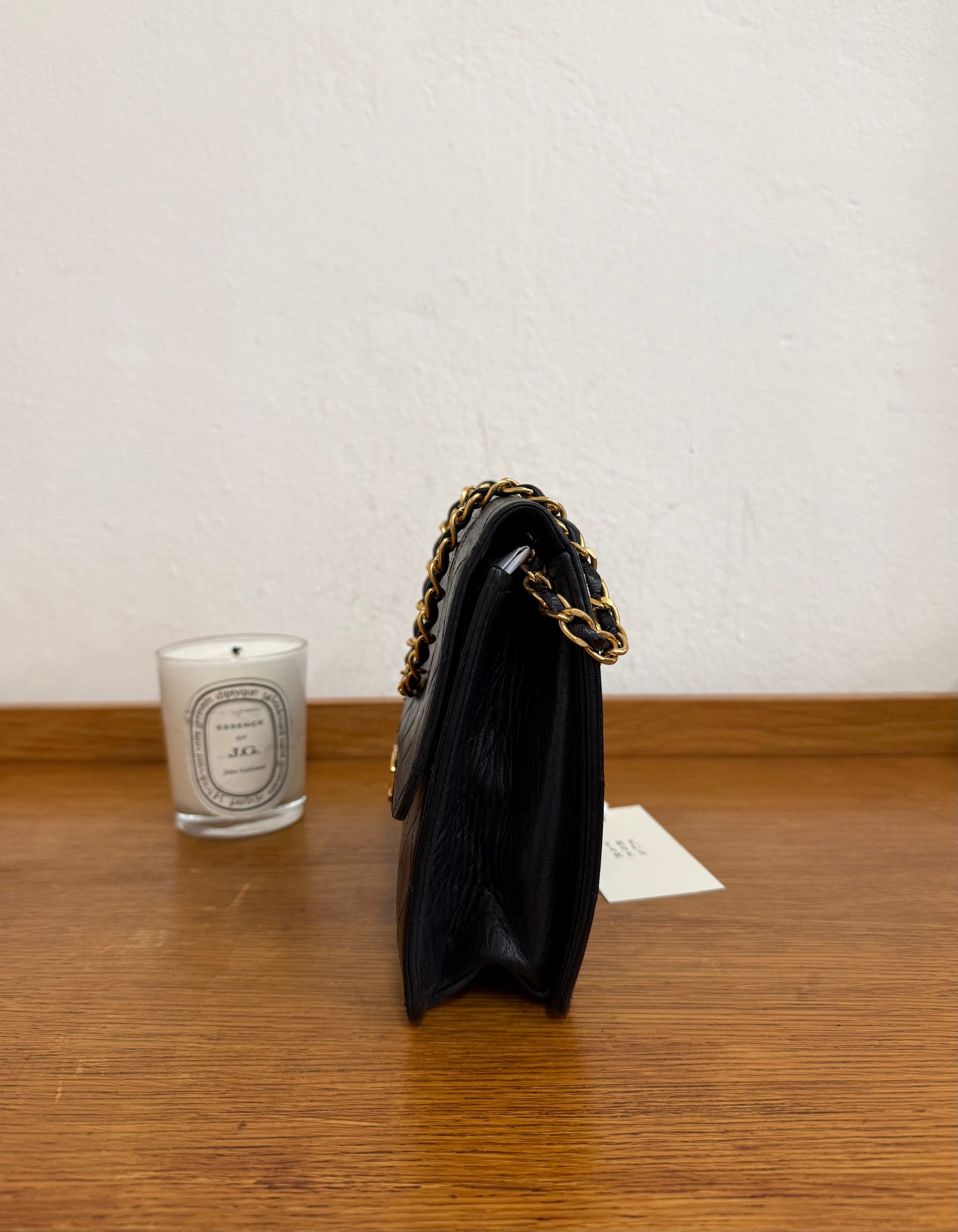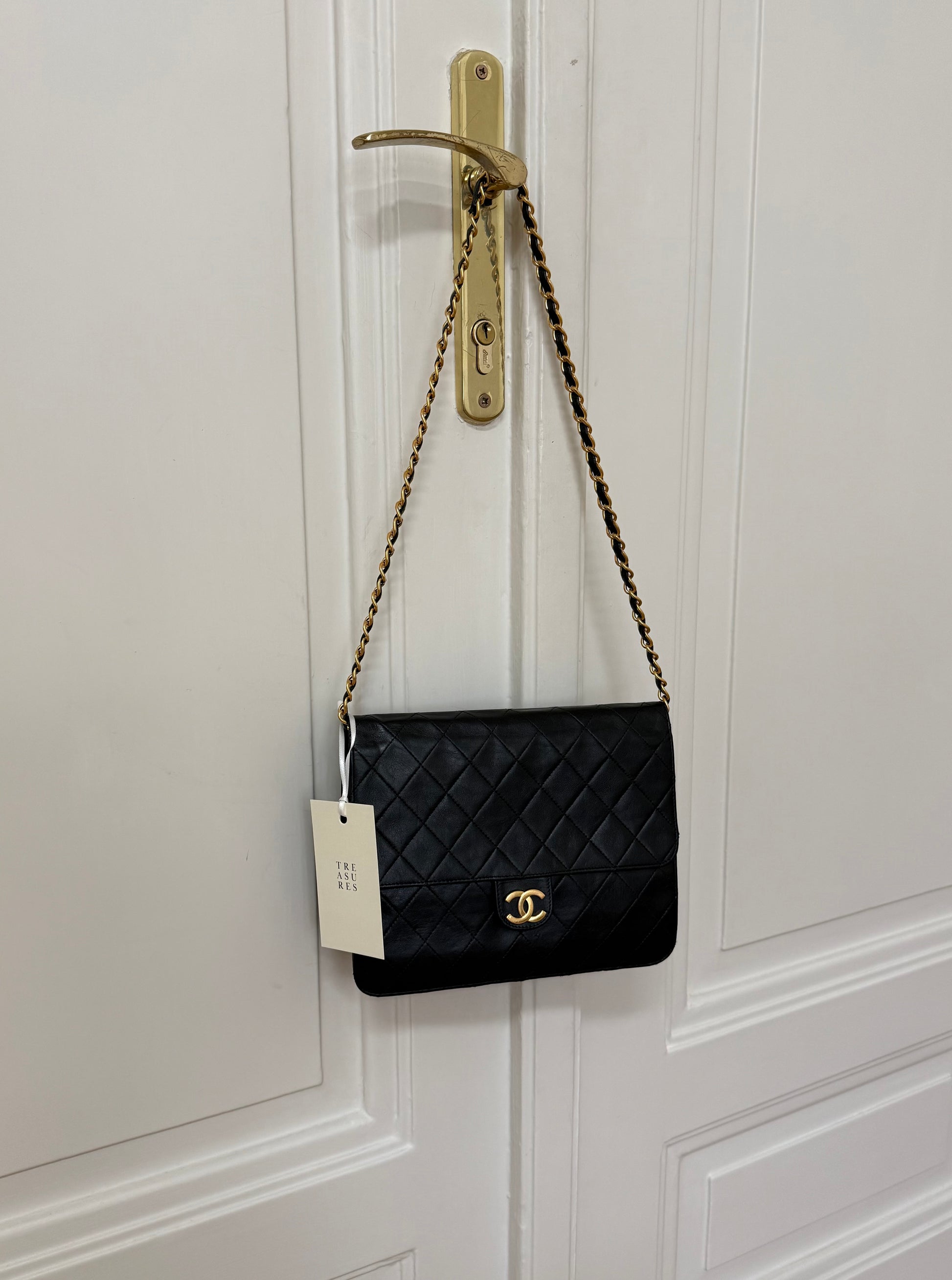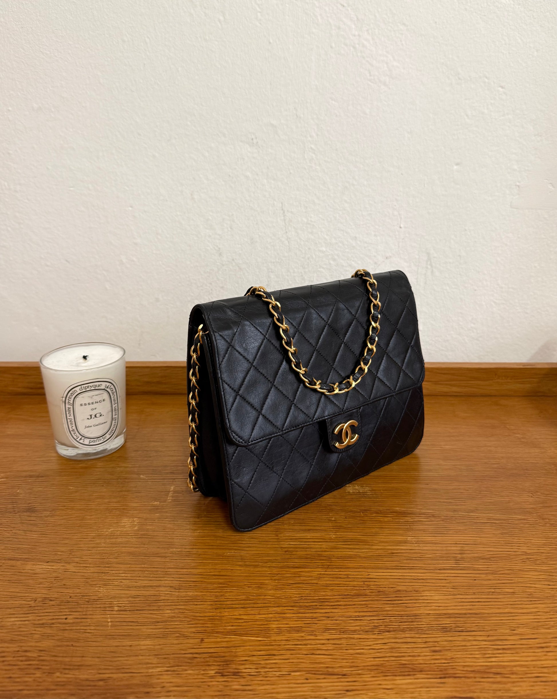 Elegantní Chanel single flap bag z jehněčí kůže v černé barvě s čerstvě 24k pozlaceným hardwarem z 80. let. Klasická oblíbená flap silueta s řetízkem a původním clasp zapínáním působí nadčasově a sofistikovaně.