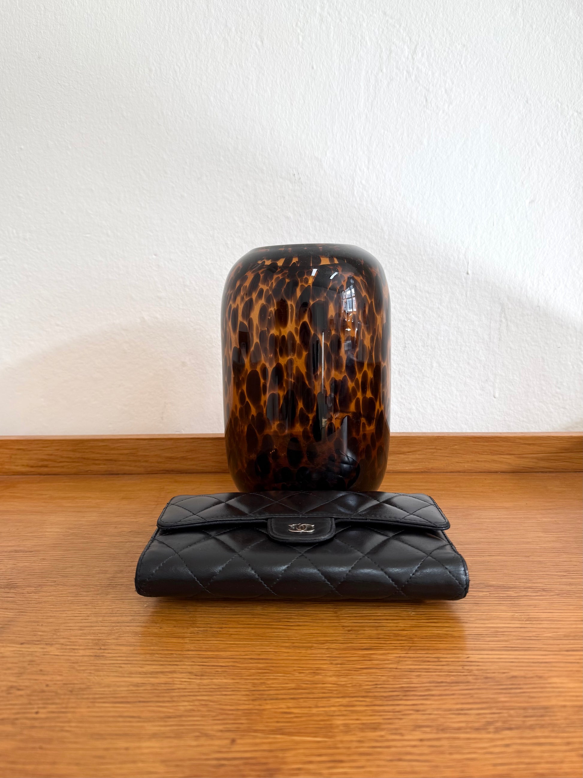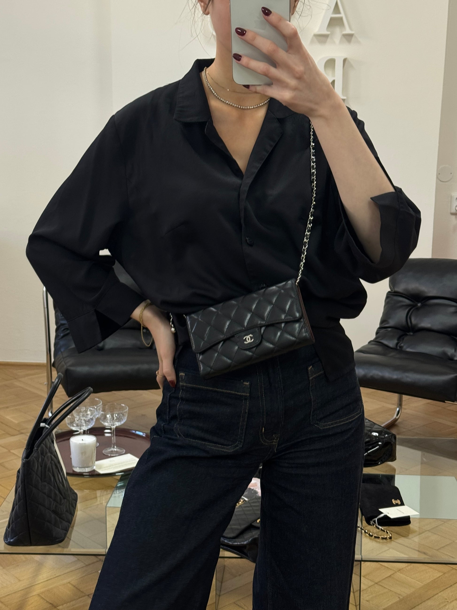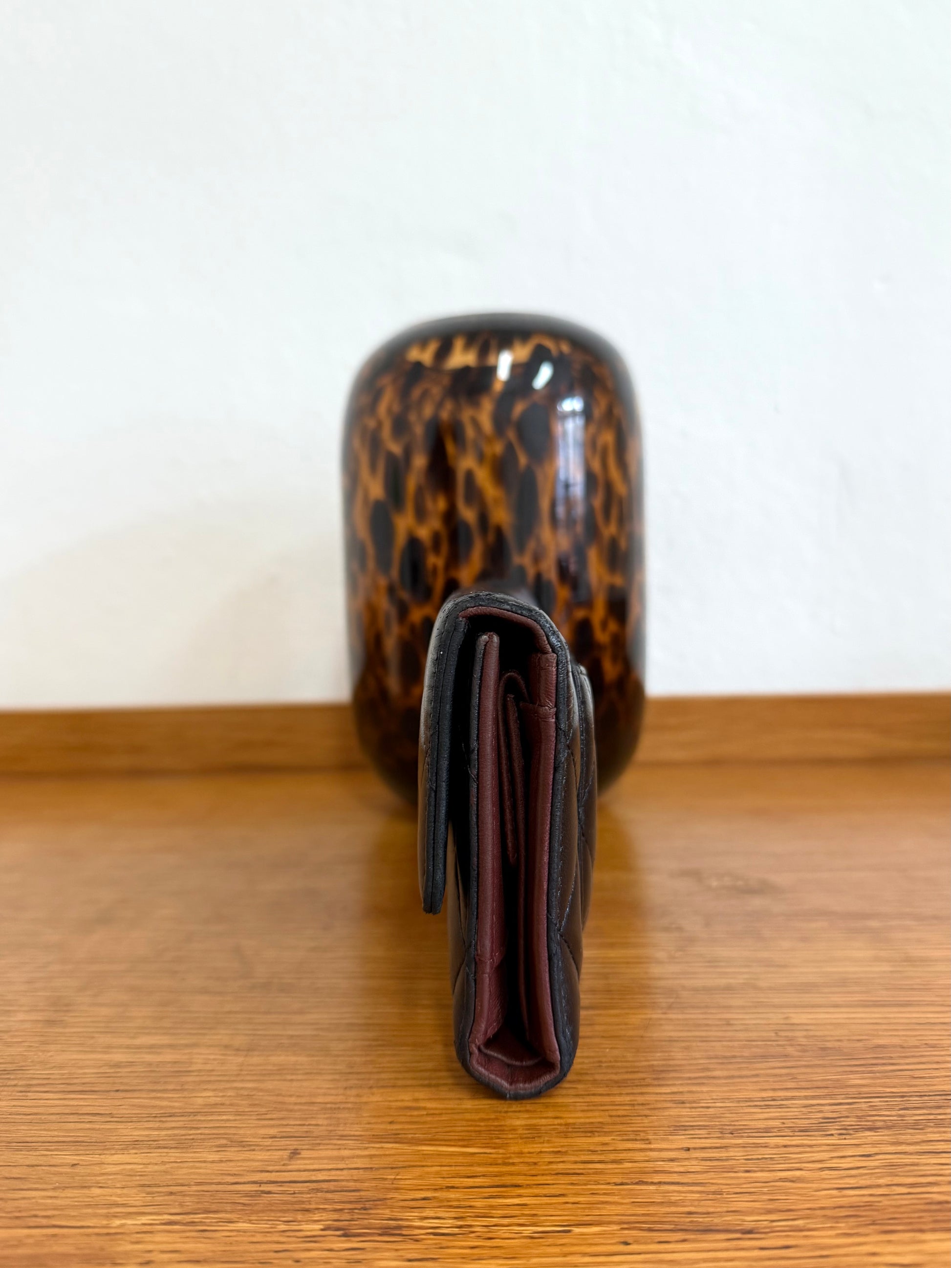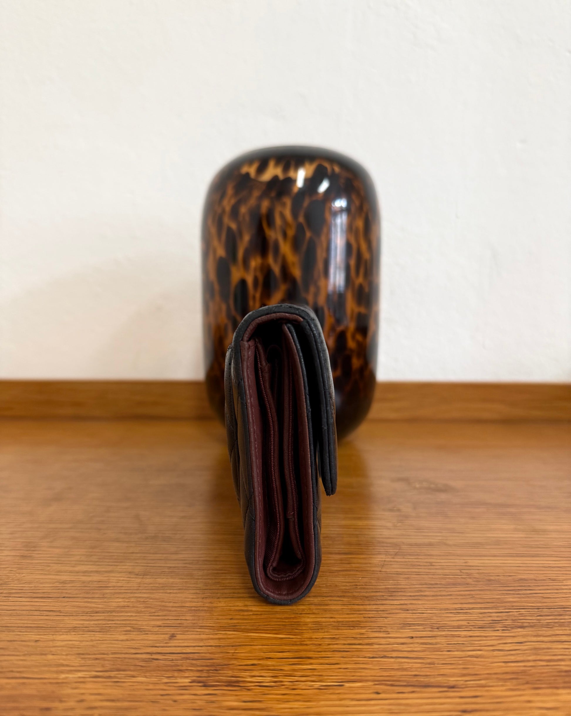 Elegantní Chanel peněženka z jehněčí kůže v černé barvě se stříbrným hardwarem a ikonickým burgundy interiérem. Nadčasový kousek, který poslouží jako psaníčko do ruky, doplněk na řetízek, nebo jako klasická peněženka do kabelky.