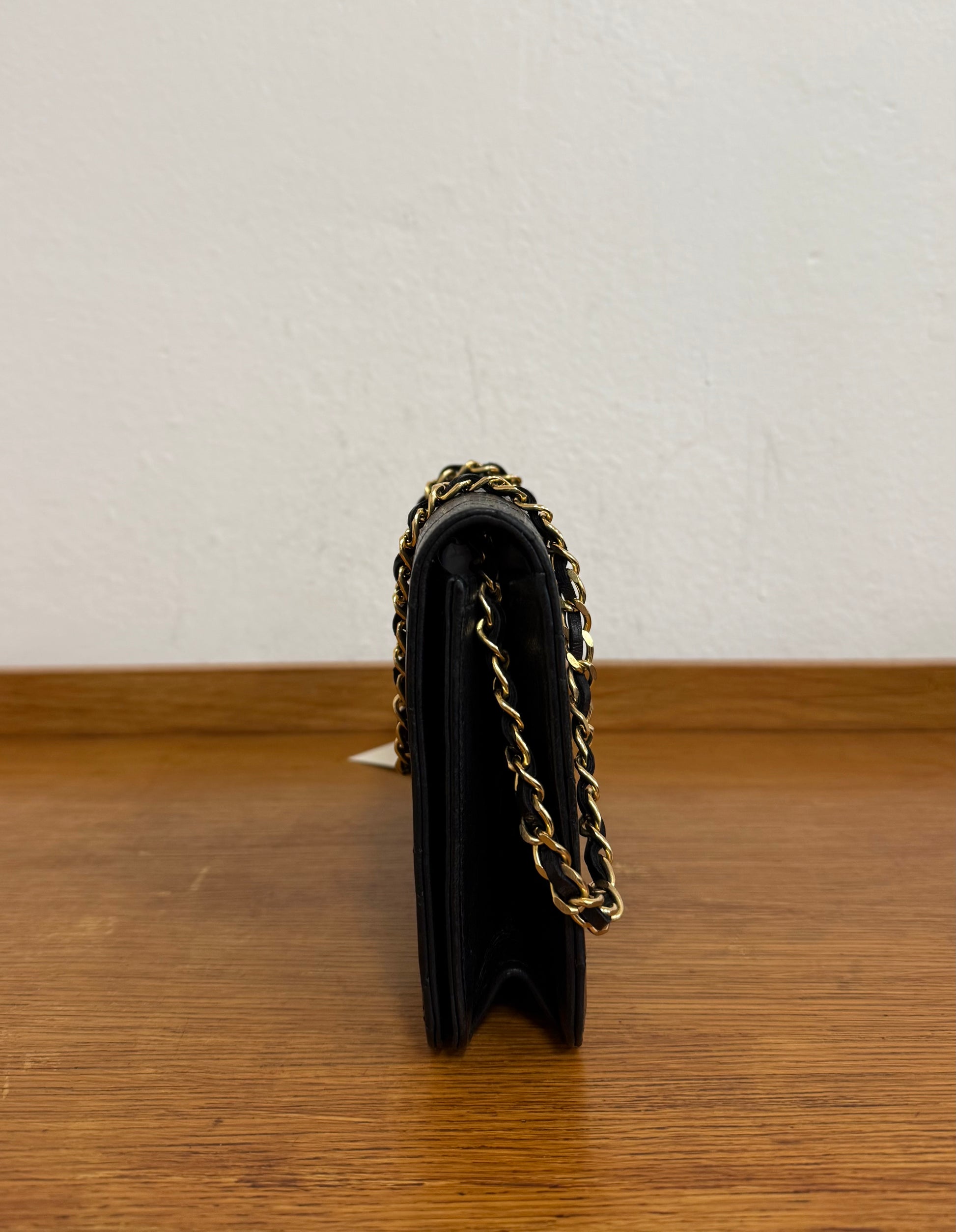 Elegantní Chanel Full Flap z jemné jehněčí kůže v černé barvě s hardwarem pozlaceným 24k zlatem. Nadčasová a univerzální silueta, kterou lze snadno proměnit z denní kabelky na večerní psaníčko – stačí jen schovat řetízek dovnitř.