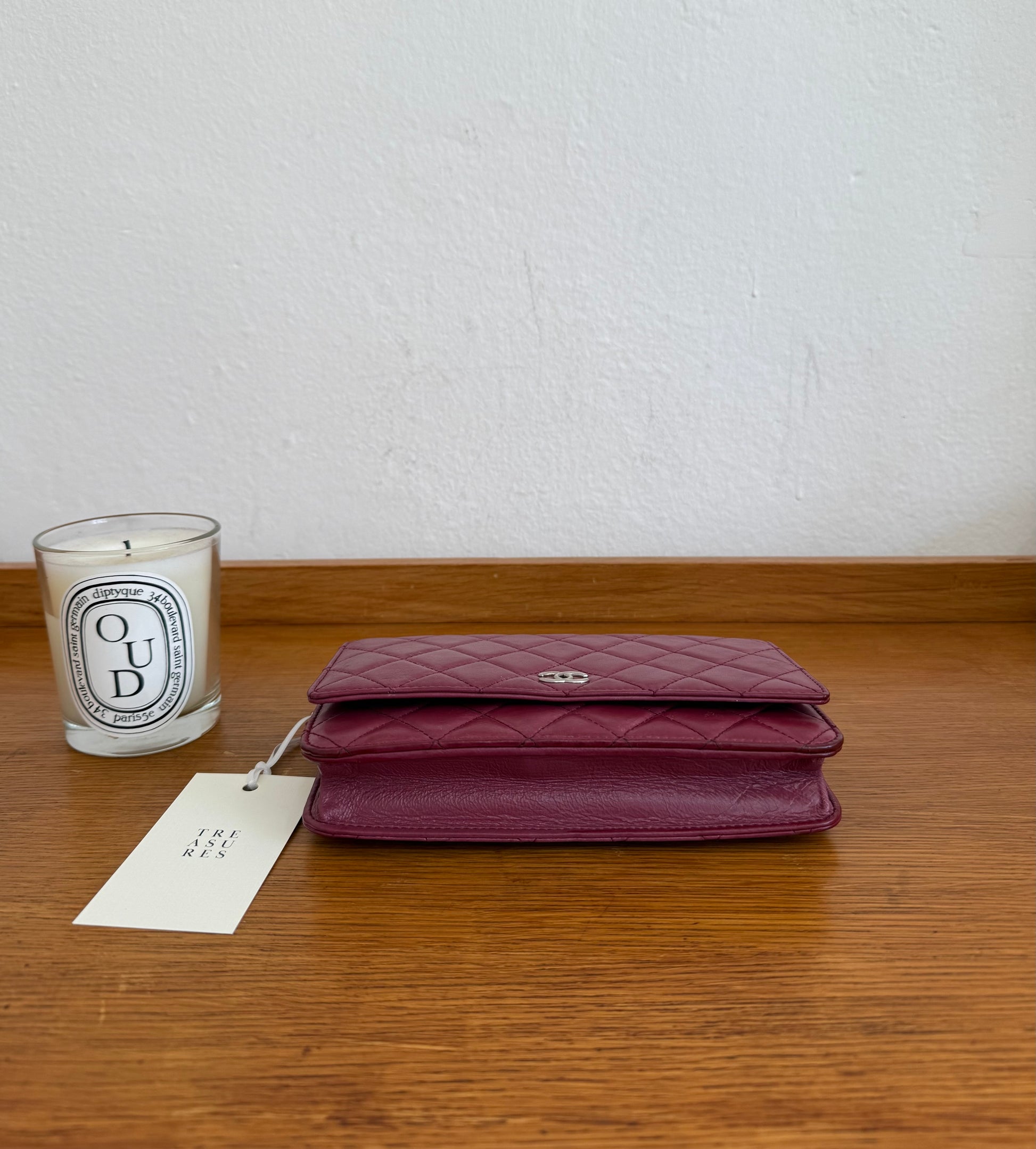 Elegantní Chanel Wallet On Chain z jemné jehněčí kůže v odstínu vínové / hroznového vína. Nadčasová minimalistická kabelka, kterou lze nosit jak přes rameno tak i jako večerní psaníčko s řetízkem uvnitř.