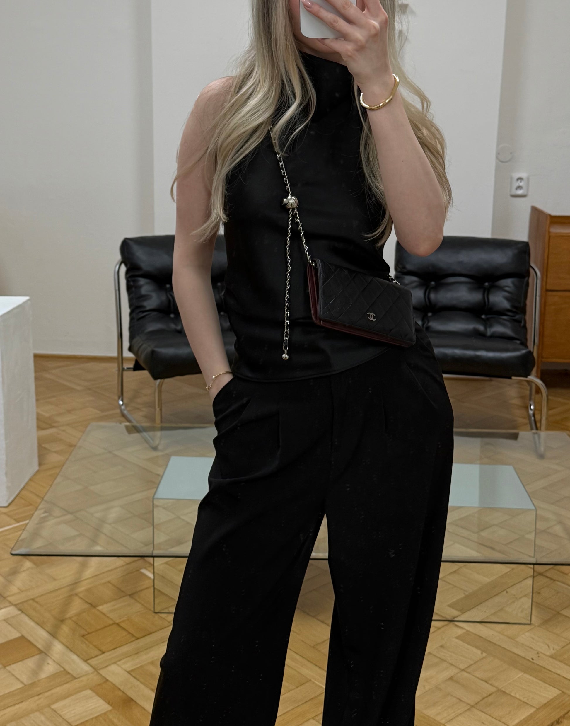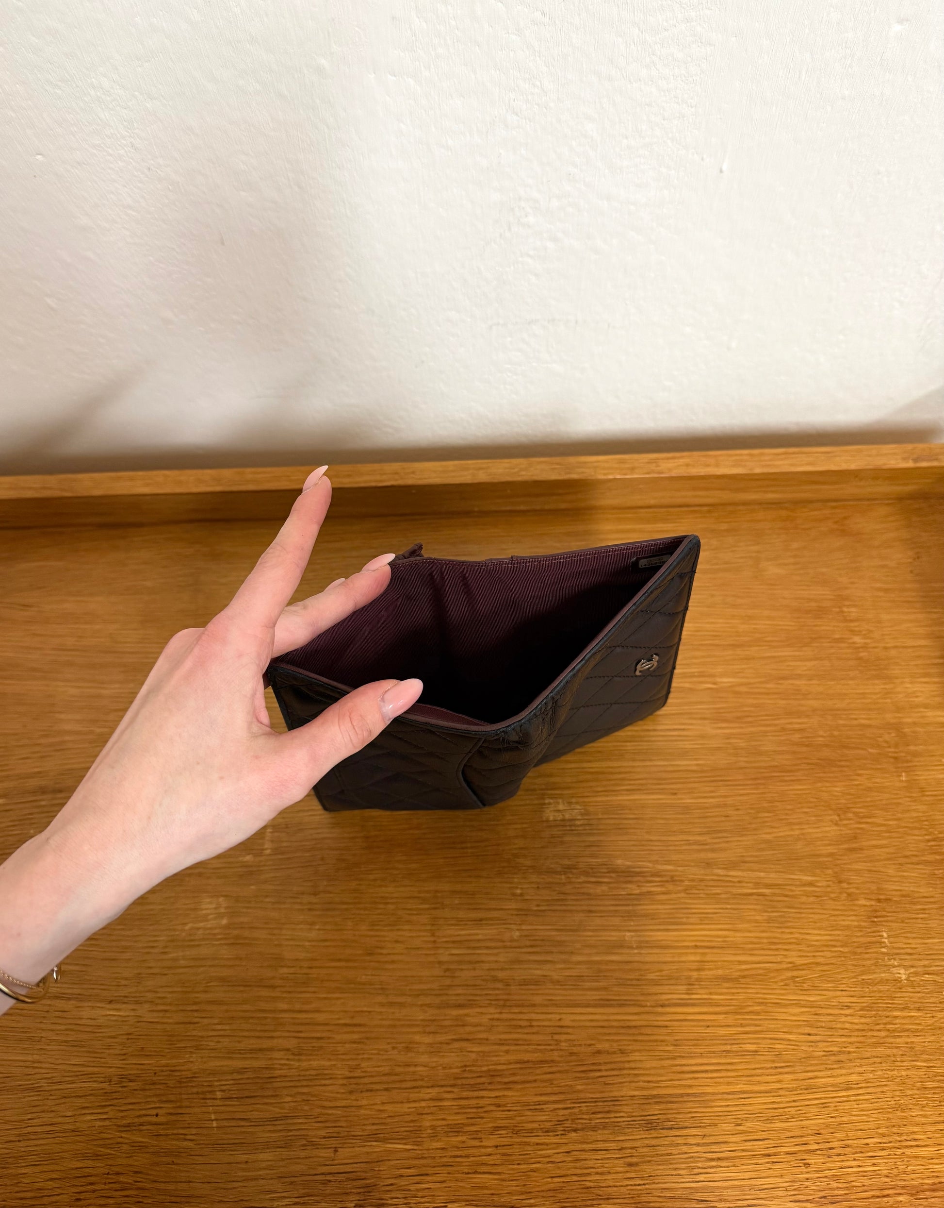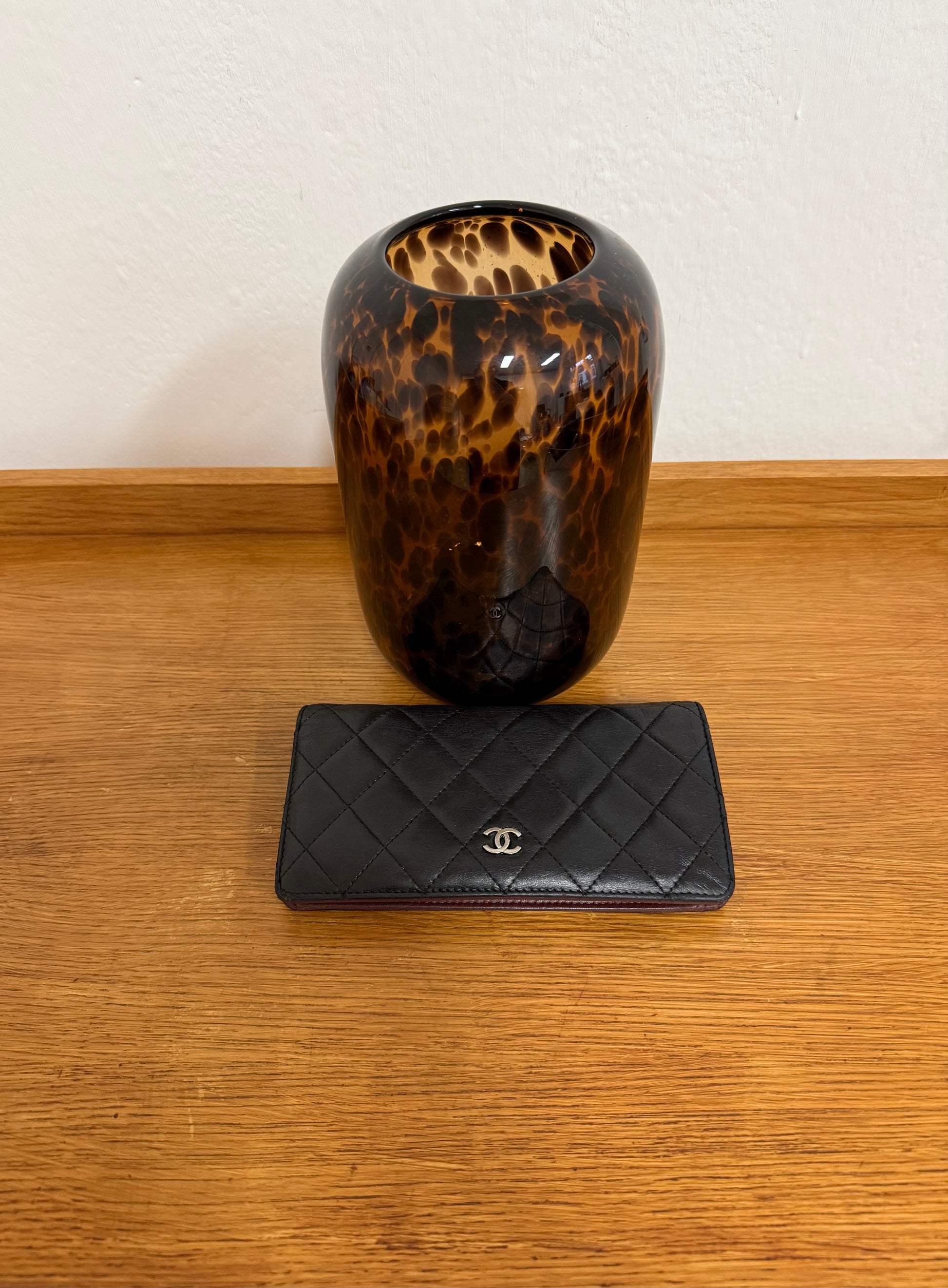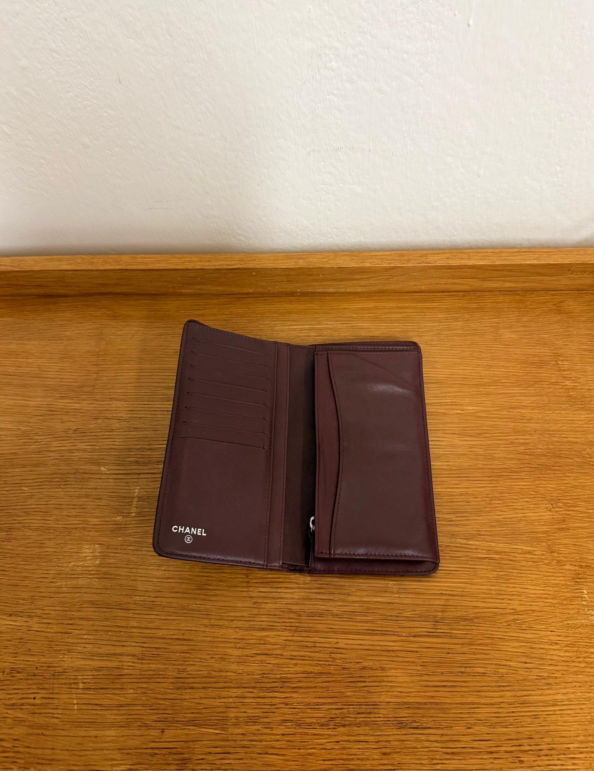 Chanel long wallet z jemné jehněčí kůže, v černé barvě se stříbrným hardwarem a ikonickým burgundy interiérem. Lze ji nosit jako psaníčko do ruky, na řetízku přes rameno, nebo jako klasickou peněženku do kabelky.