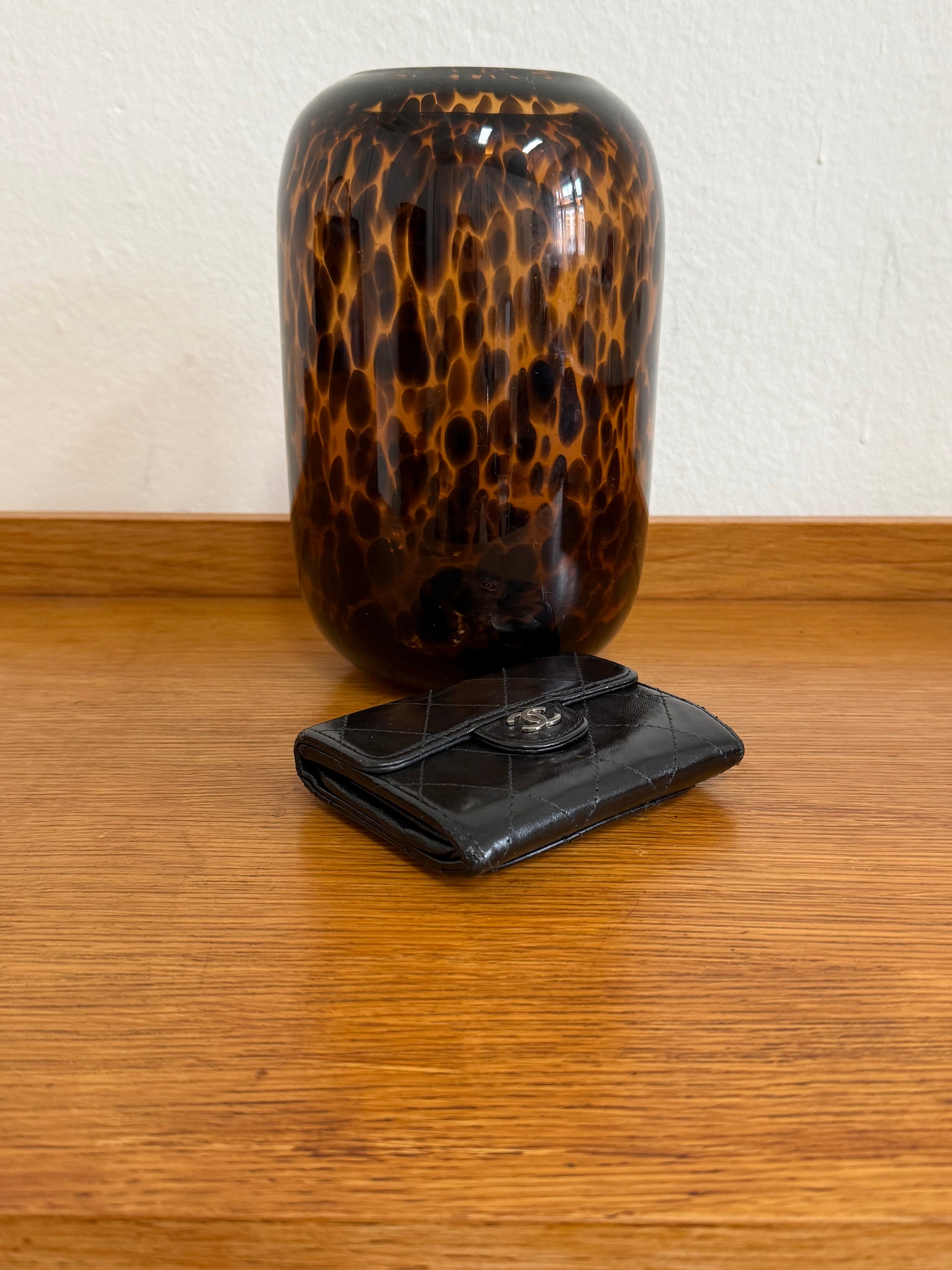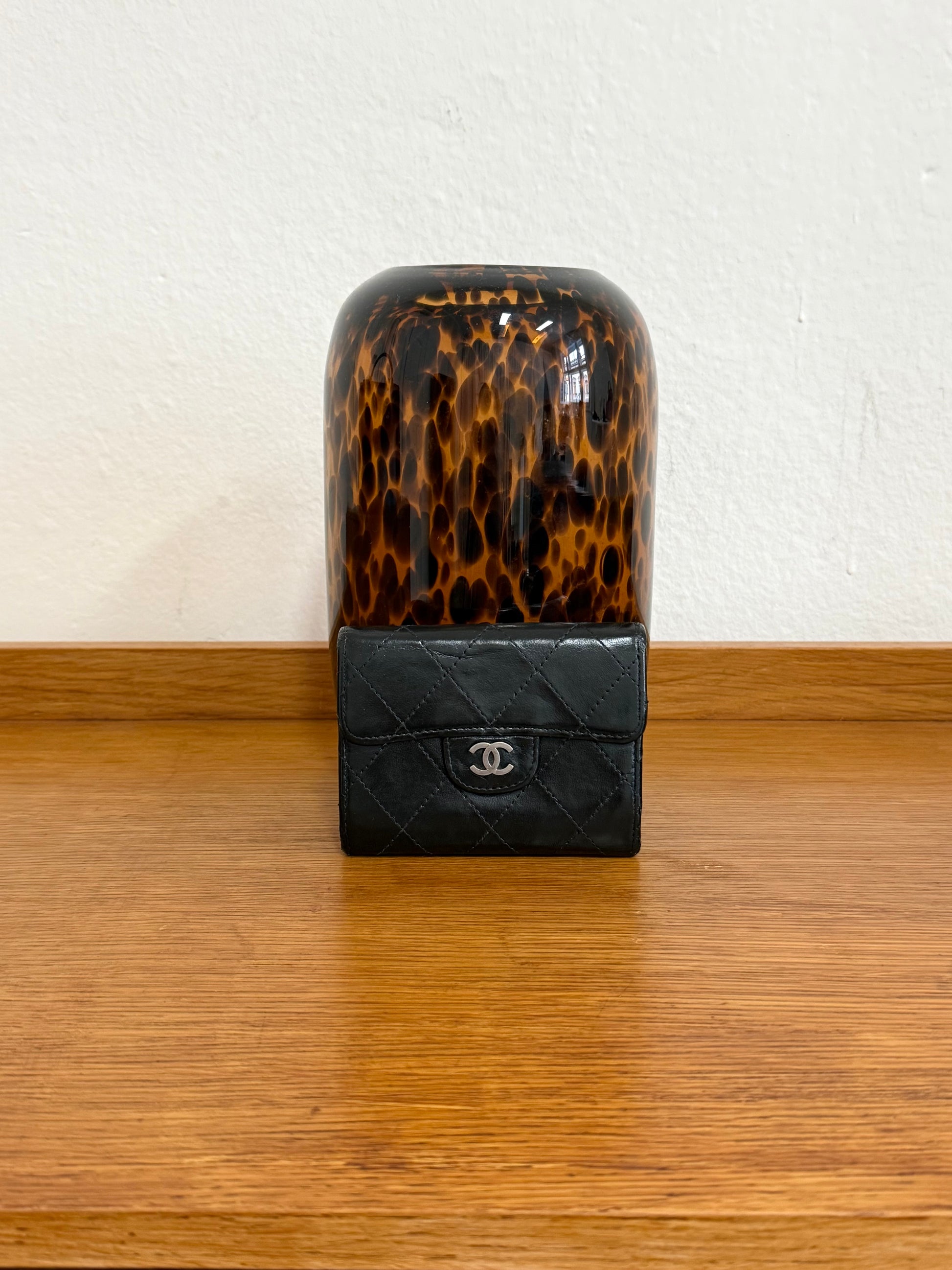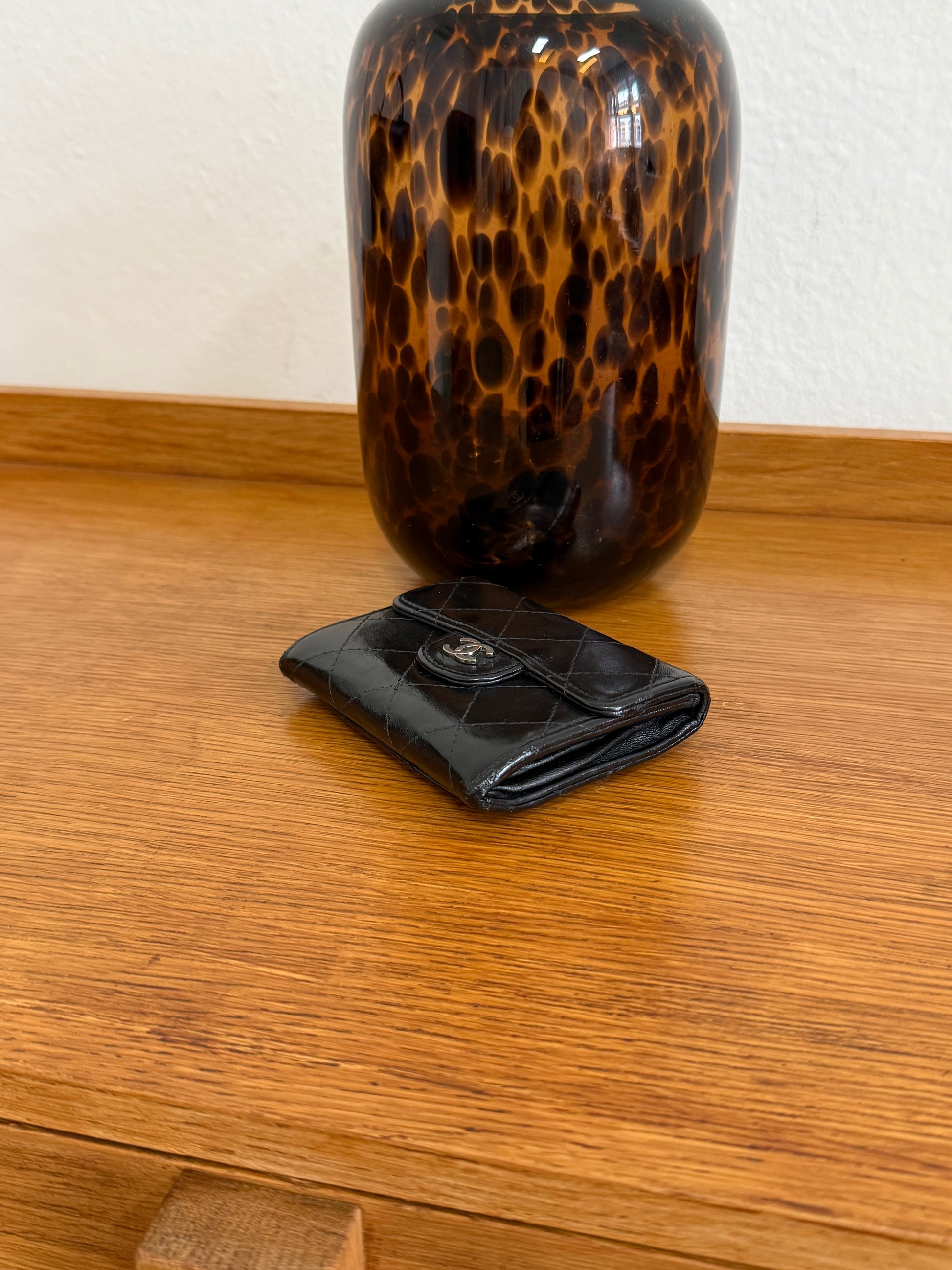 Chanel mini peněženka z černé kůže v elegantním nadčasovém provedení. Kompaktní, stylový kousek, který lze nosit na řetízku jako doplněk nebo jako klasickou peněženku do kabelky.