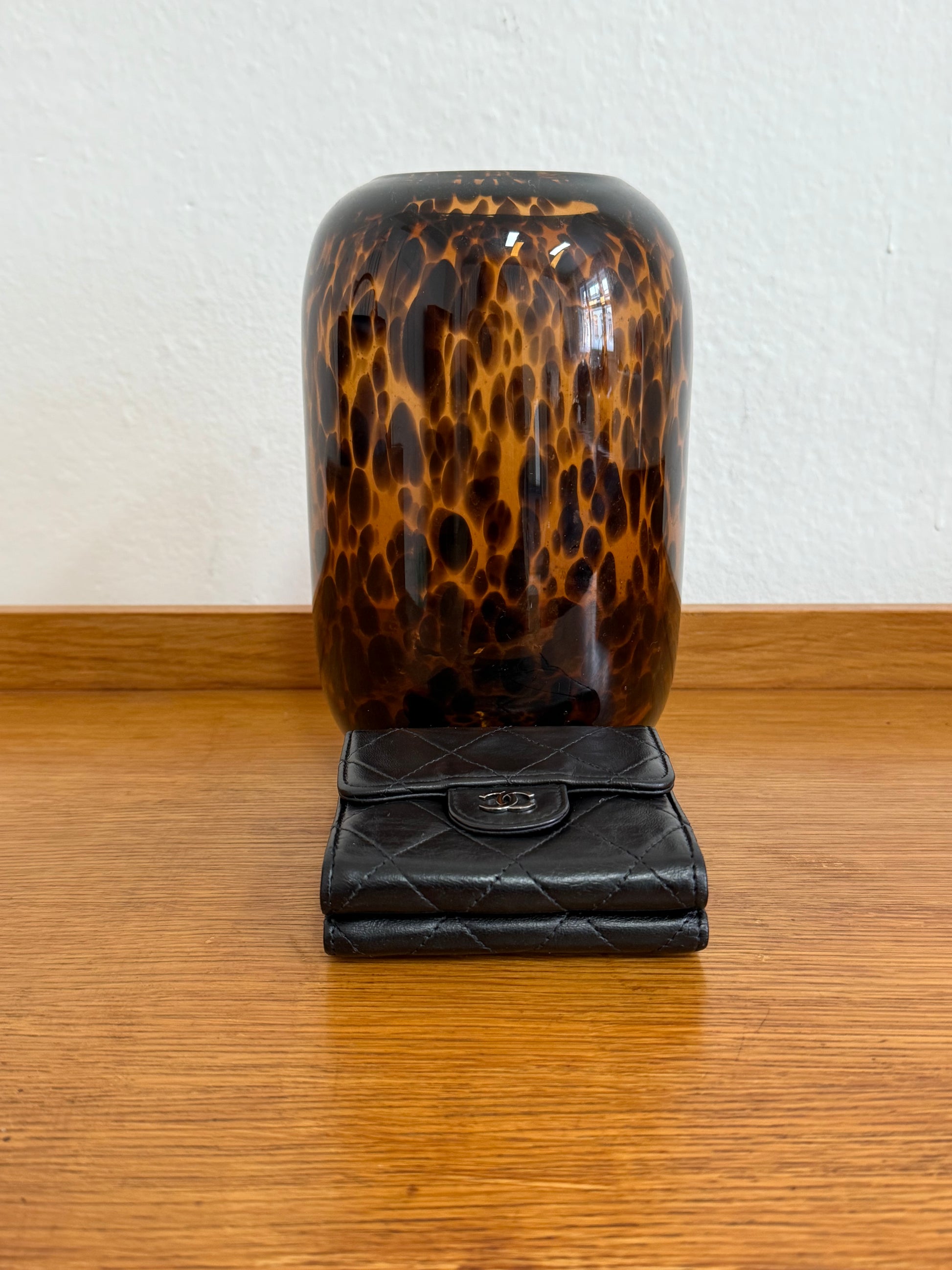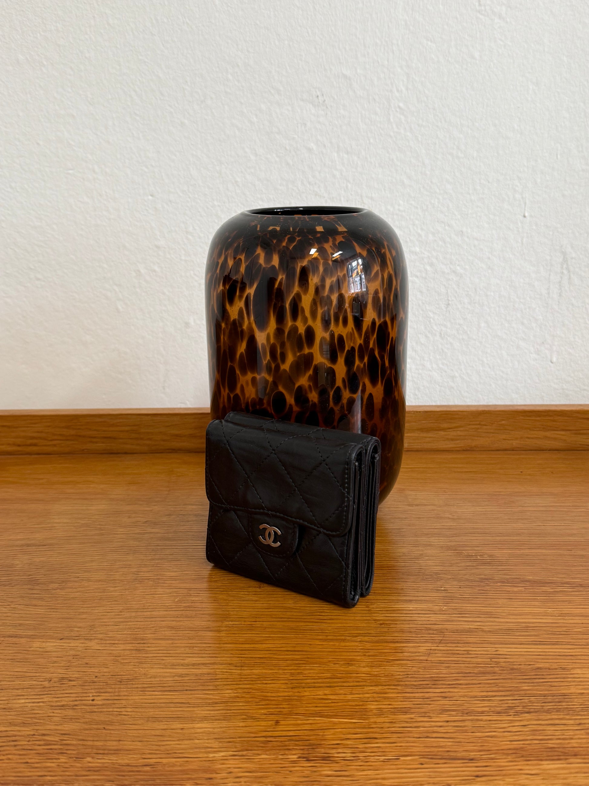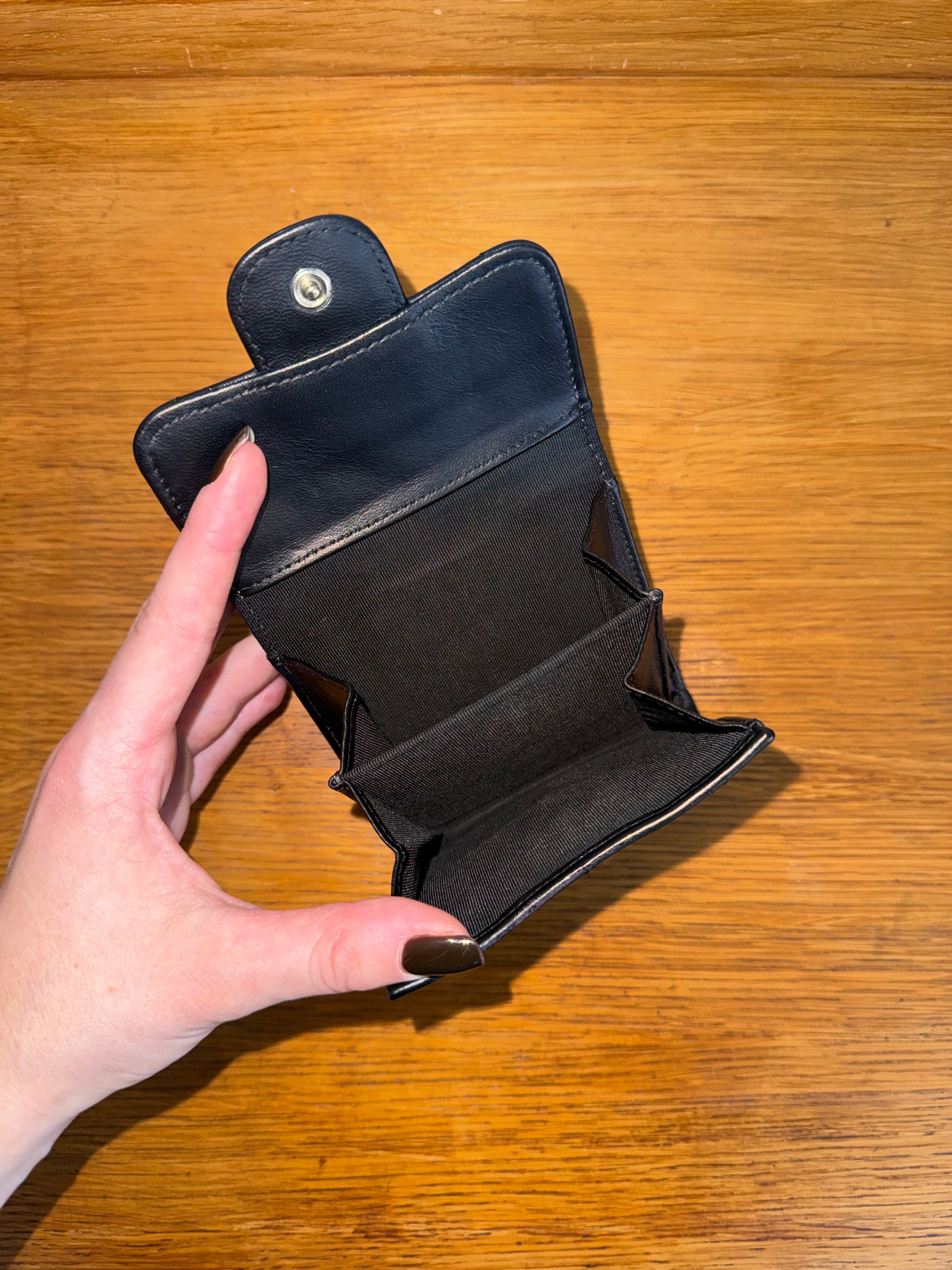Chanel double-sided malá peněženka z černé kůže ze série 10 se stříbrným hardwarem. Nadčasový, elegantní kousek, který lze nosit jako jemný doplněk na řetízku nebo jako klasickou peněženku do kabelky.