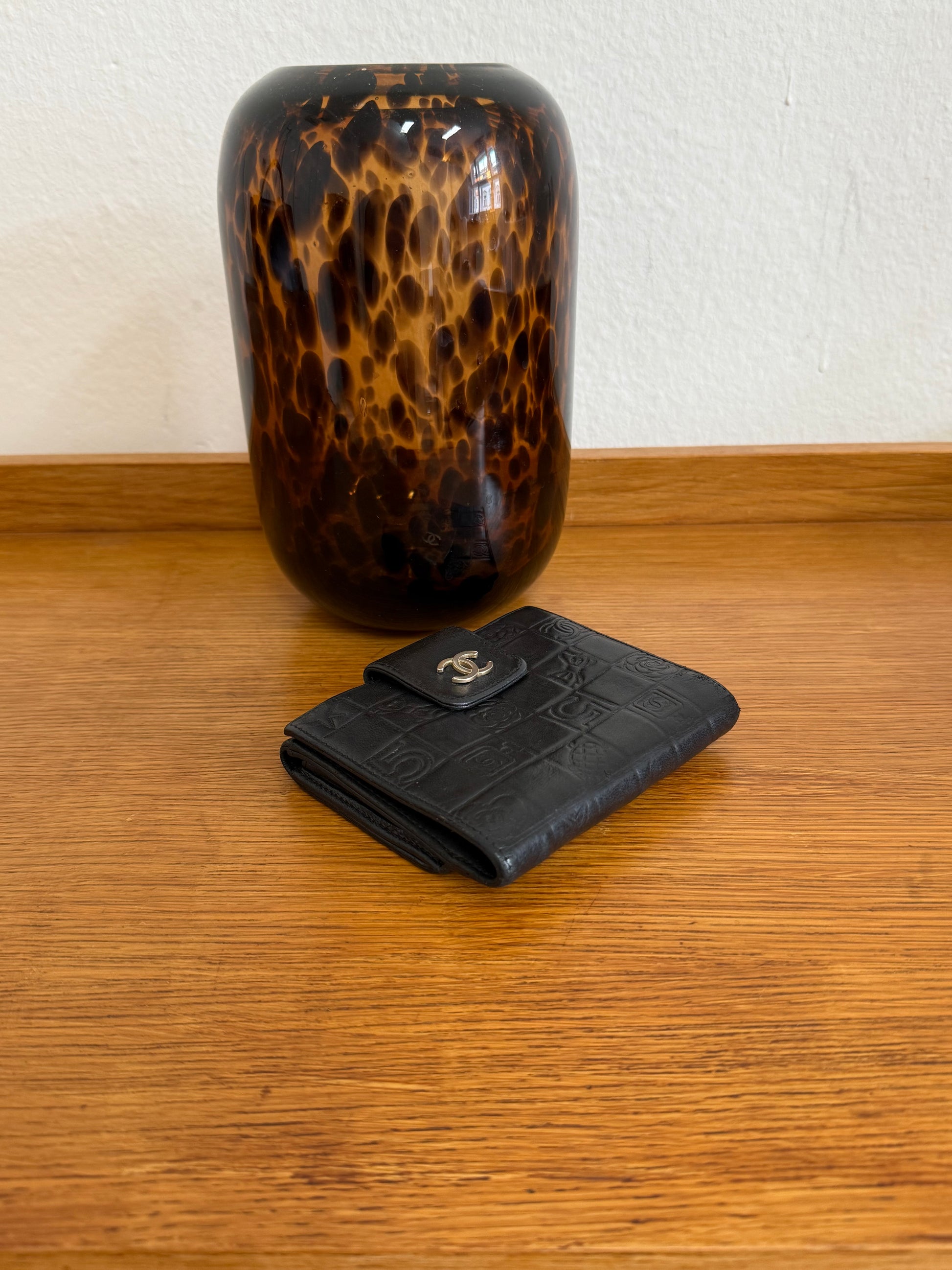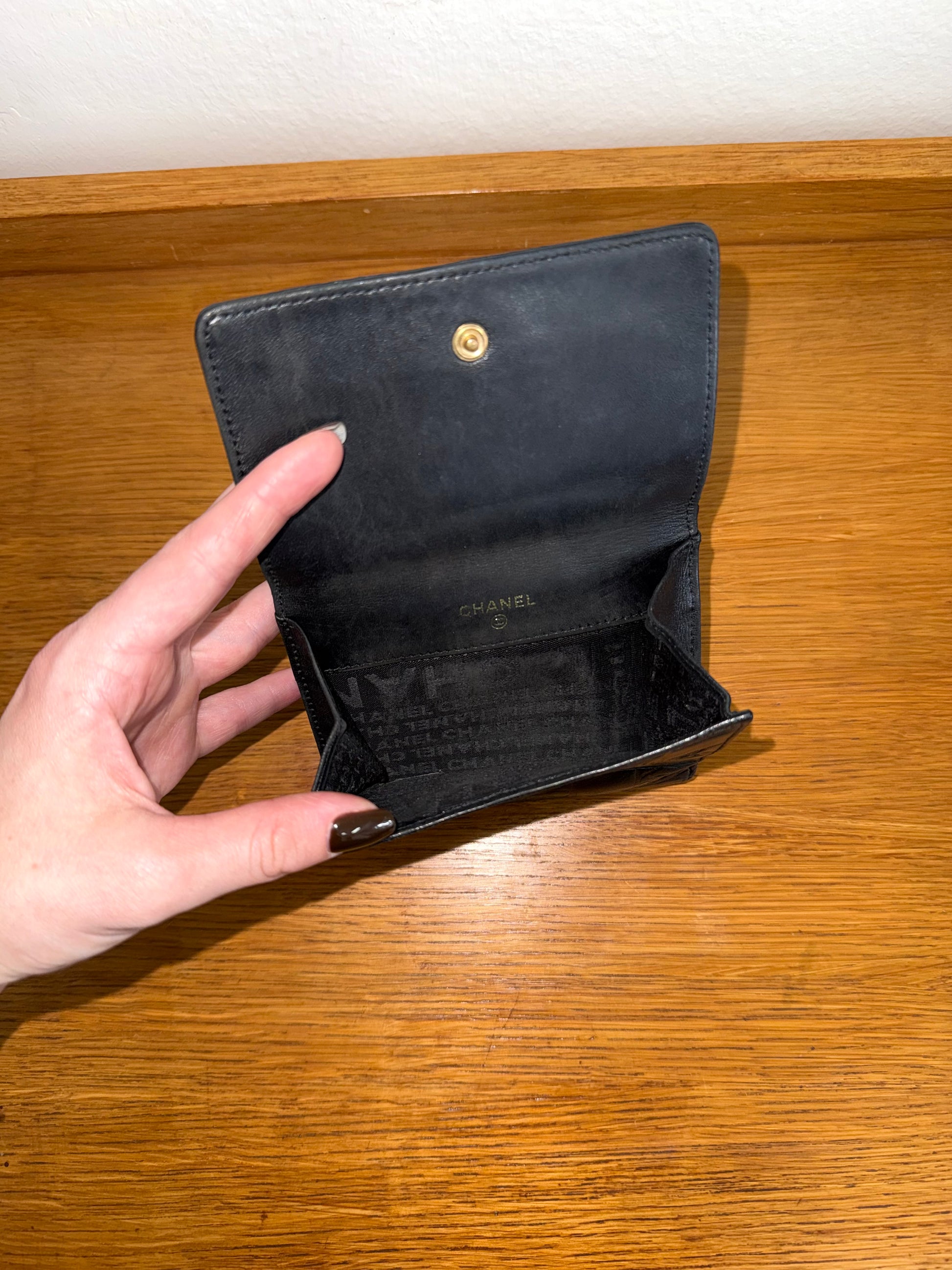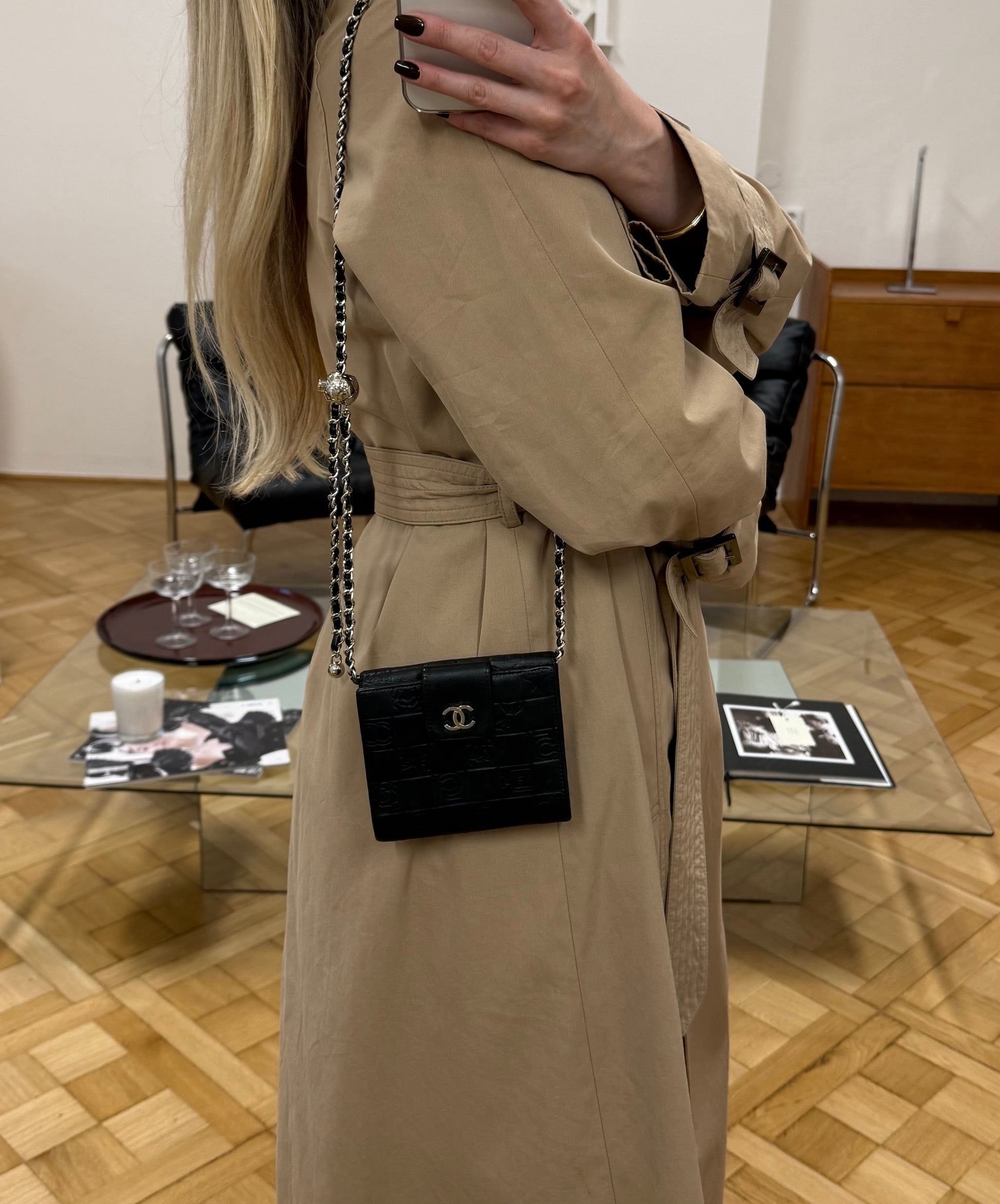 Chanel No.5 mini peněženka v černé barvě z jemné jehněčí kůže s chocolate bar reliéfem. Stylový, kompaktní kousek, který lze nosit na řetízku jako elegantní doplněk nebo jako klasickou peněženku do kabelky.