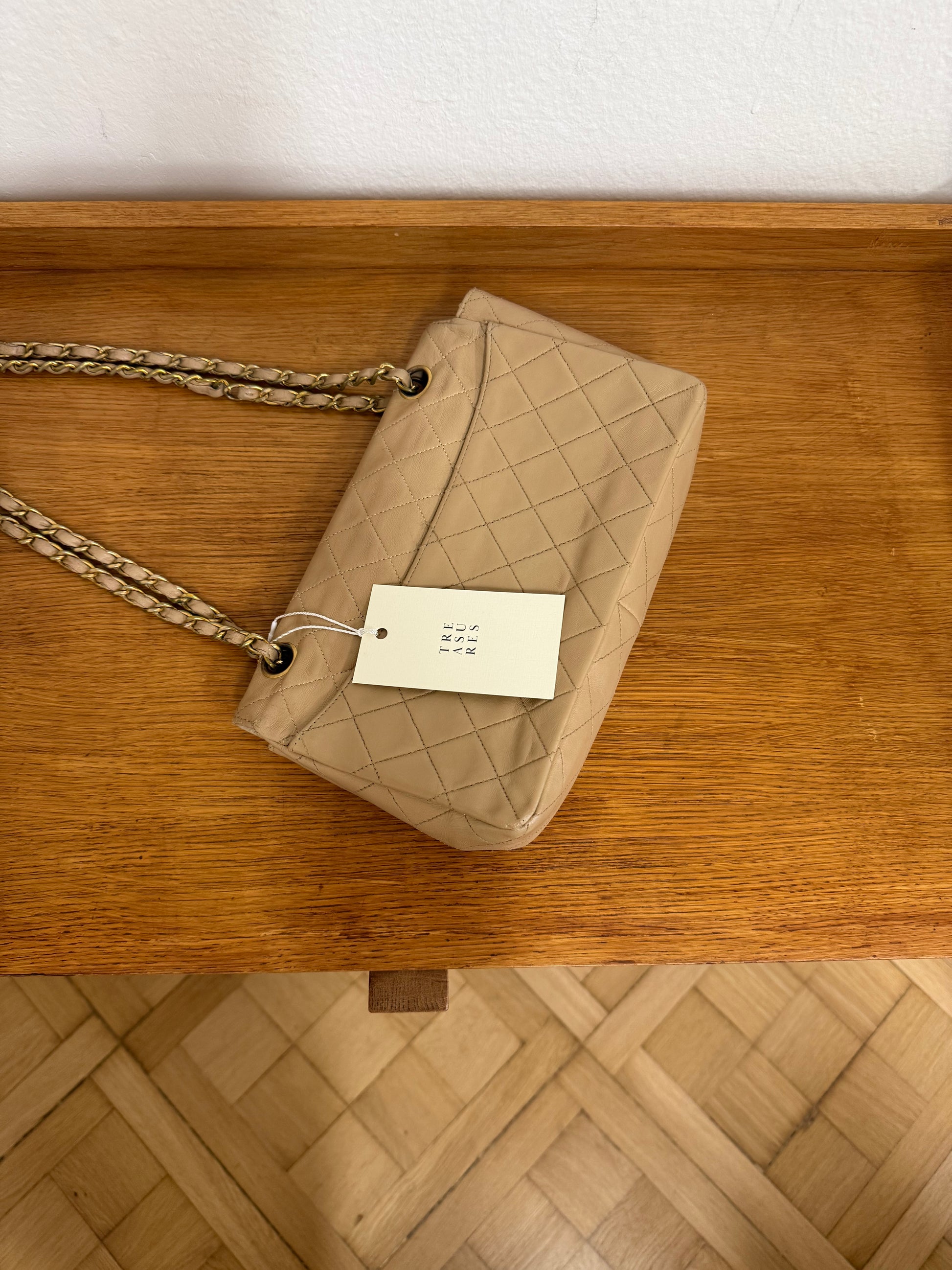 Elegantní Chanel Classic Flap bag z jemné jehněčí kůže v nadčasové béžové.