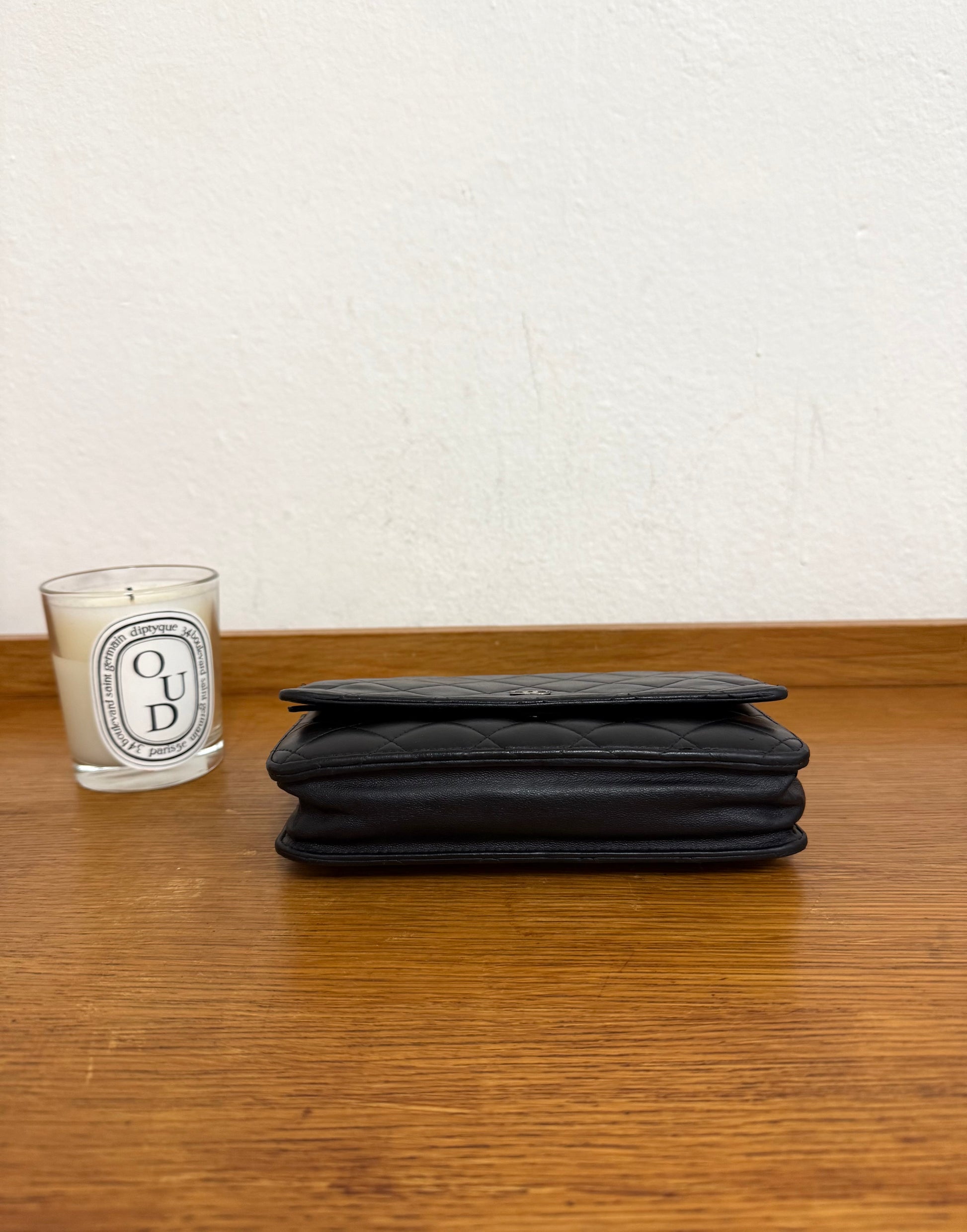 Elegantní Chanel Wallet On Chain z jemné jehněčí kůže v černé barvě se stříbrným hardwarem. Nadčasová minimalistická silueta a oblíbený model. Řetízek lze schovat dovnitř a z denní kabelky se během chvilky stane večerní psaníčko.