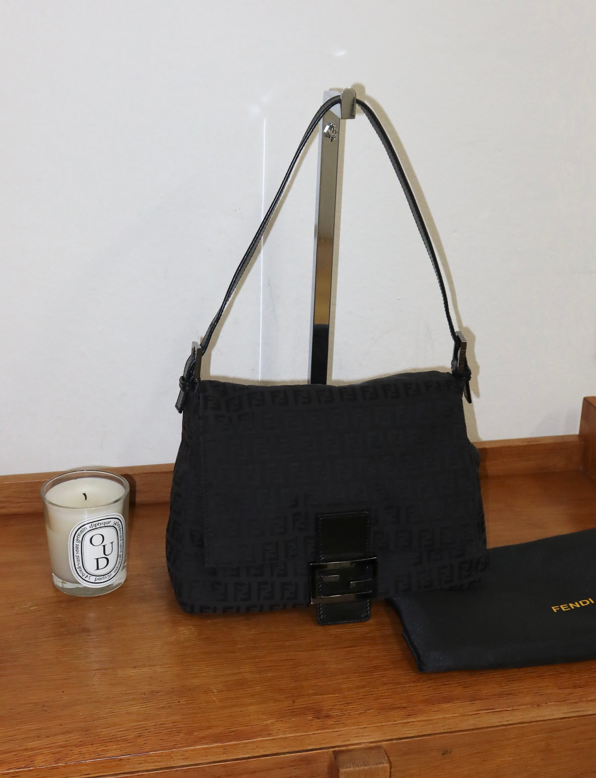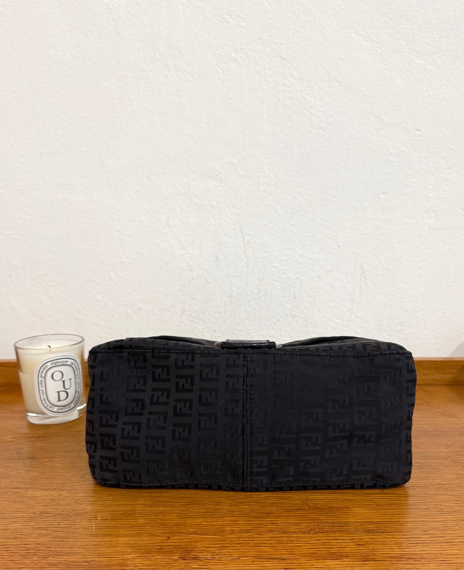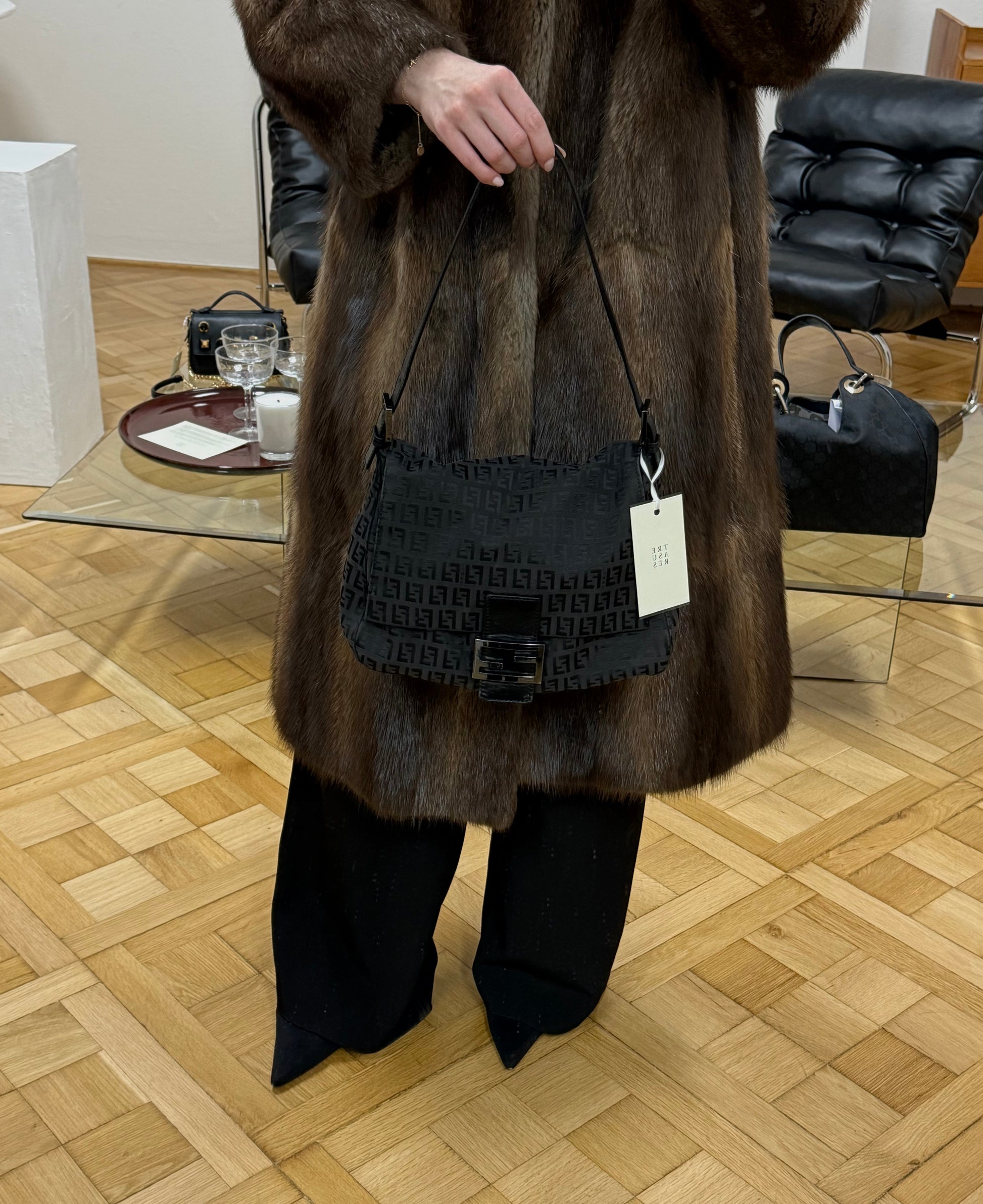 Ikonická Fendi Mamma Baguette z zucca canvasu v klasickém šedočerném monogramu. Nadčasová silueta, ideální na denní nošení.