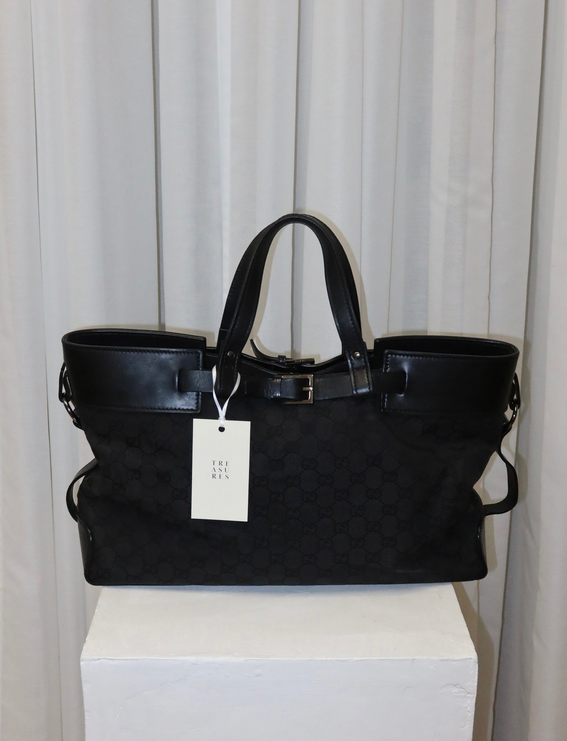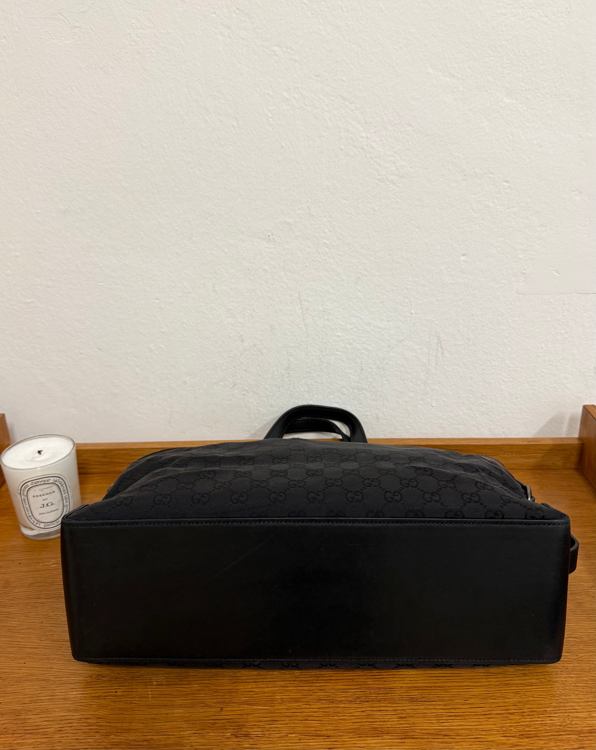 Elegantní Gucci GG Belt Tote Bag v černém GG canvasu s černými koženými detaily a stříbrným hardwarem. Nadčasová a praktická silueta, ideální pro každodenní nošení i pracovní dny. Díky své velikosti pohodlně pojme notebook i všechny nezbytnosti.
