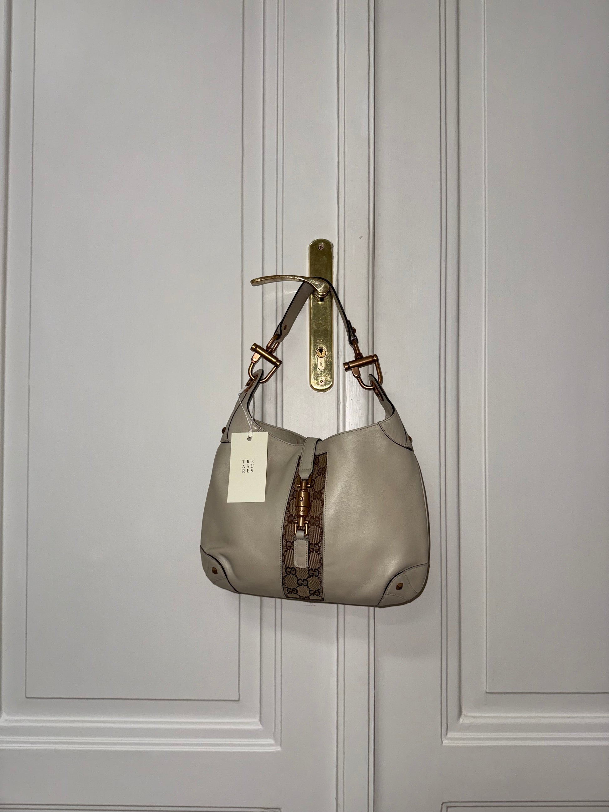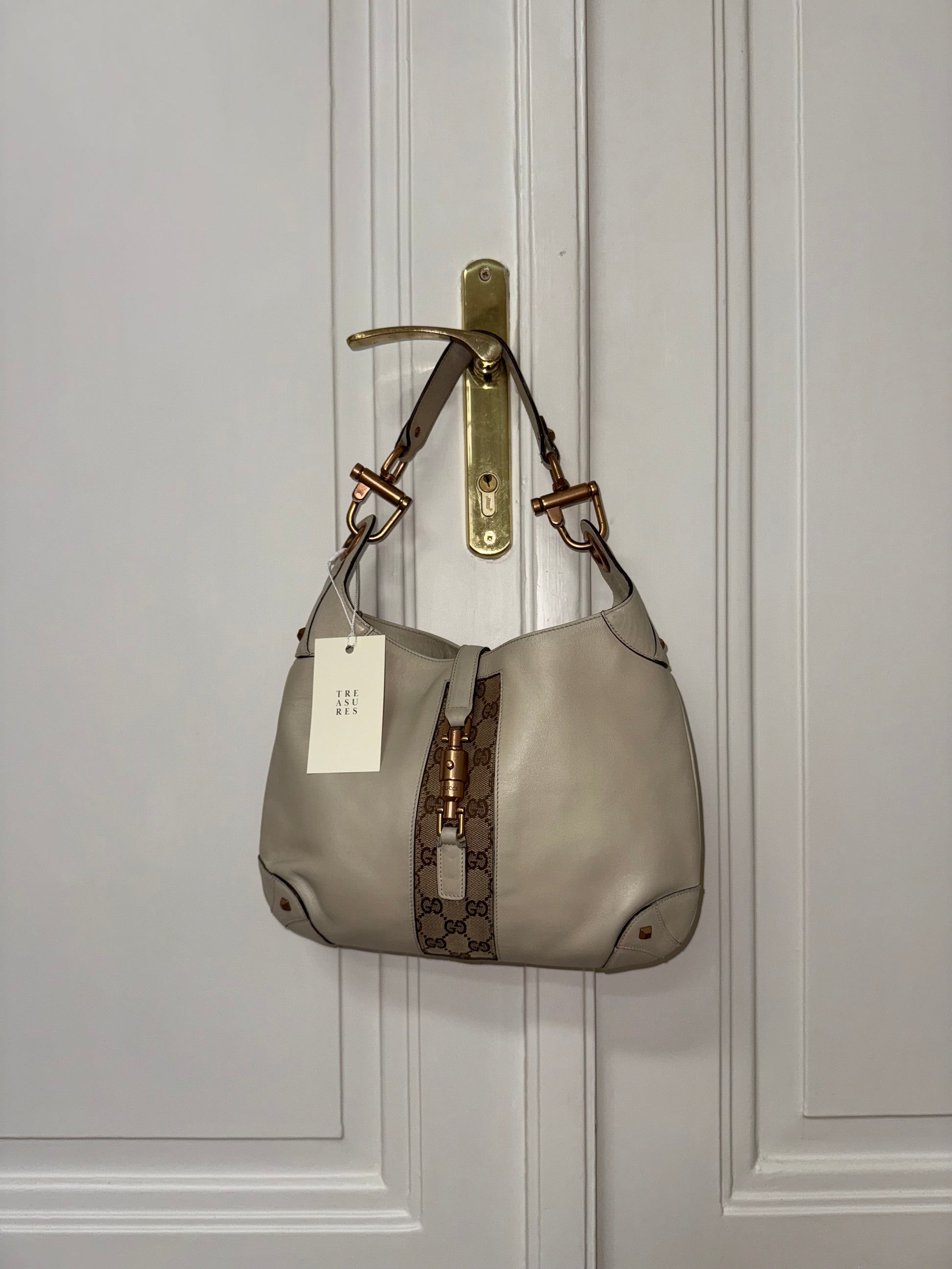 Klasická Gucci Jackie 1961 v béžovém GG monogram canvasu se zlatým hardwarem.
