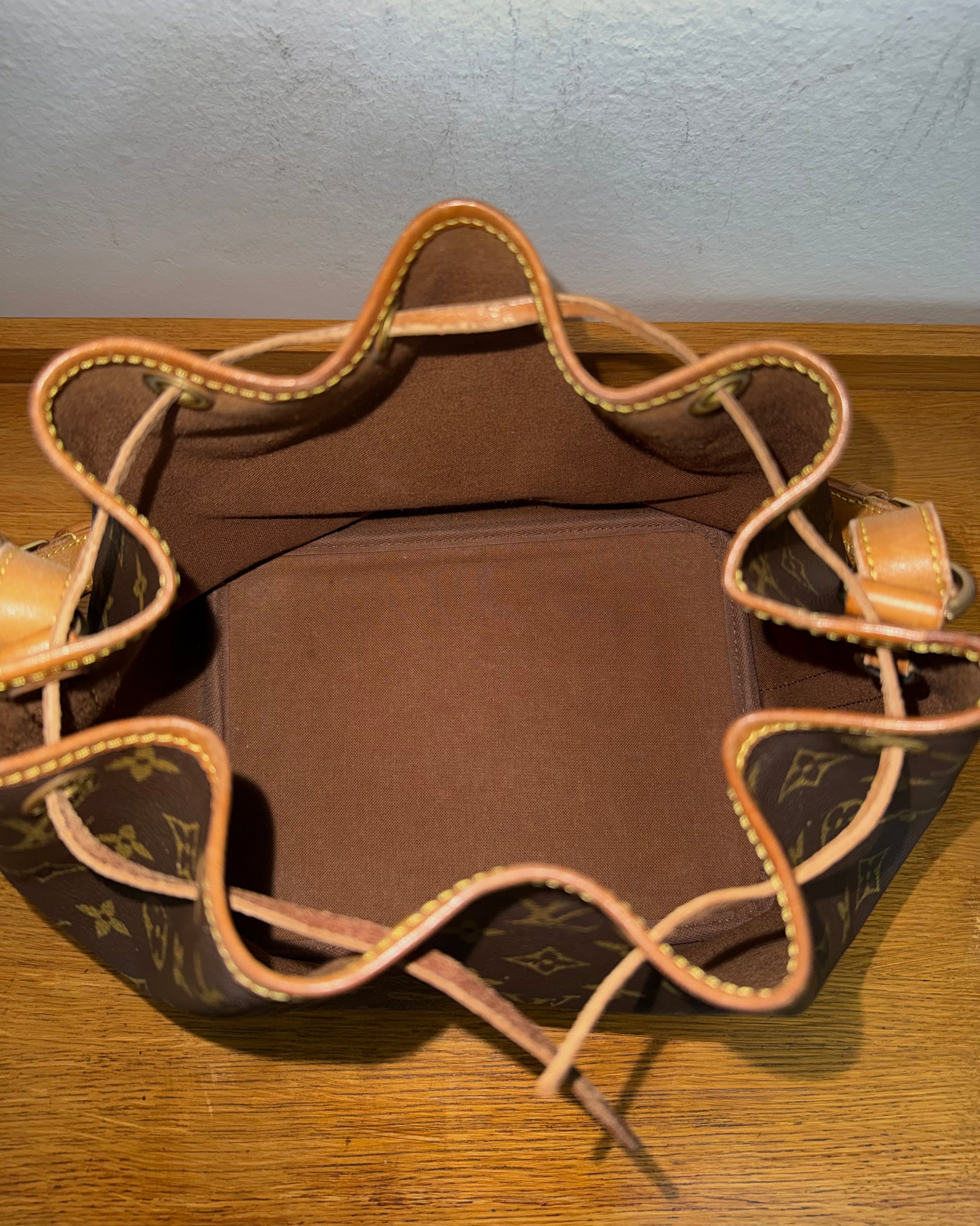 Klasická Louis Vuitton Petite Noé z odolného monogram canvasu s koženými prvky. Nadčasový bucket bag, který se skvěle hodí pro každodenní nošení, prostorný a přitom elegantní.