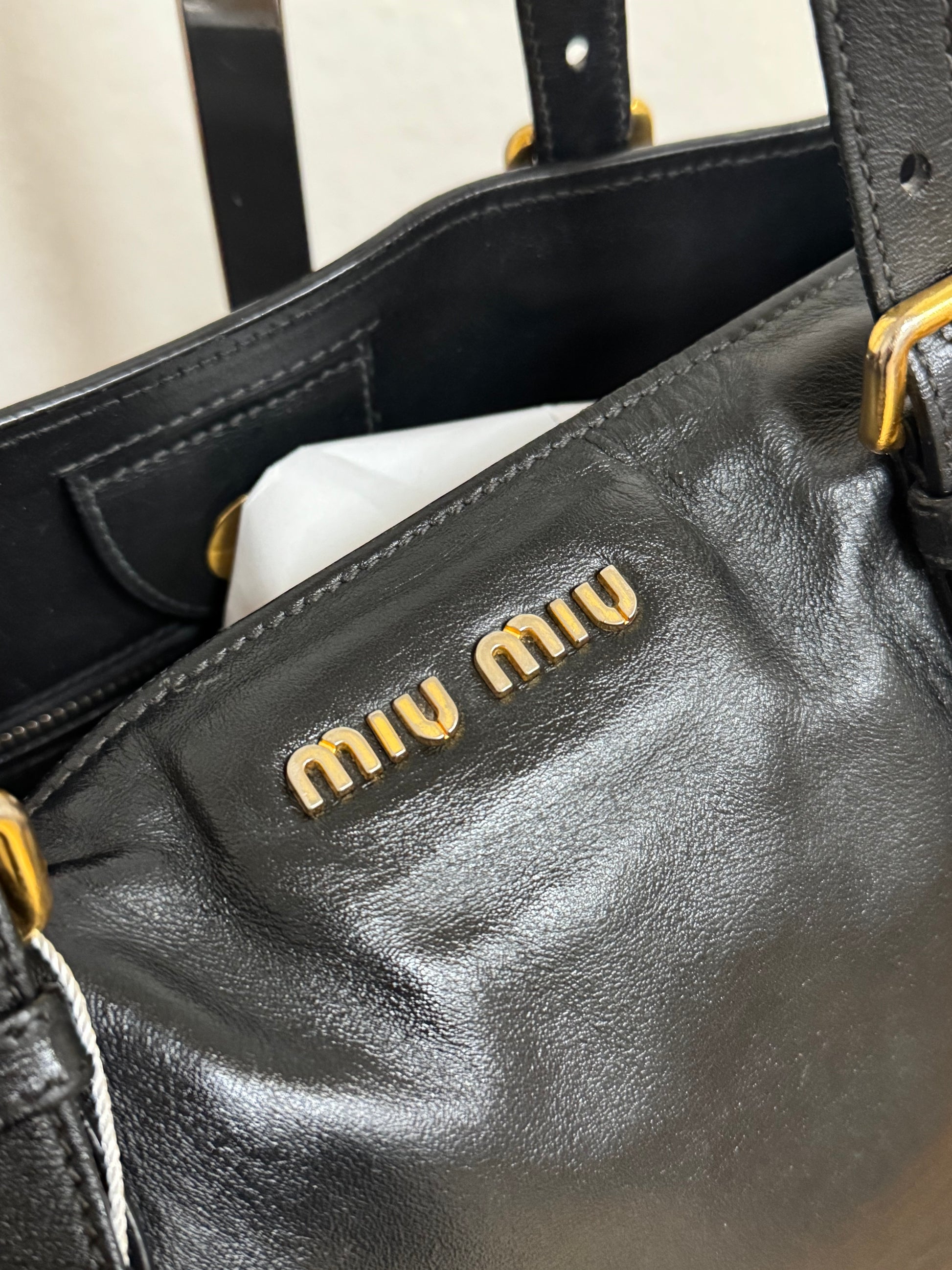 Miu Miu tote bag z černé kůže se zlatým hardwarem a cvočky. Stylová a praktická – ideální do práce, na notebook nebo jako chic společník pro každý den.
