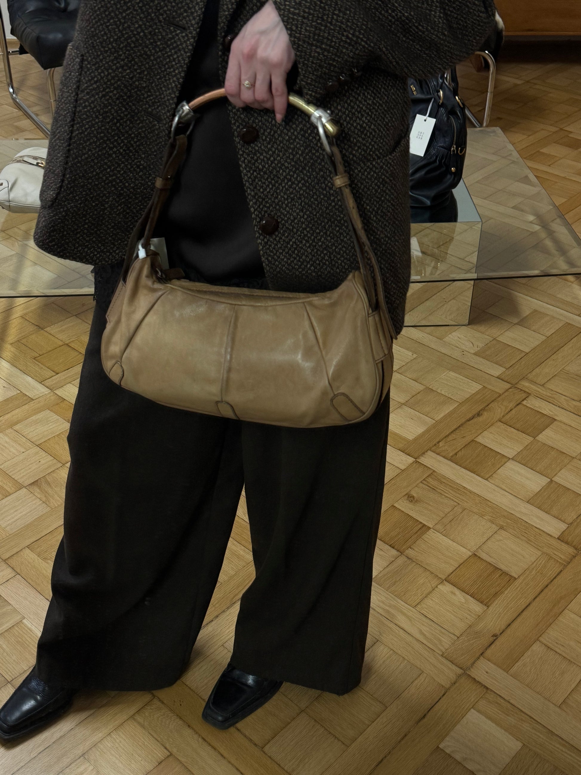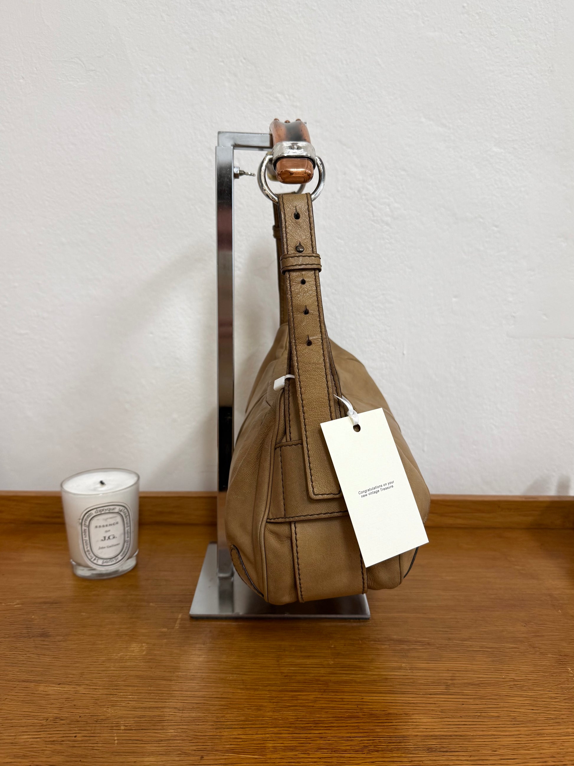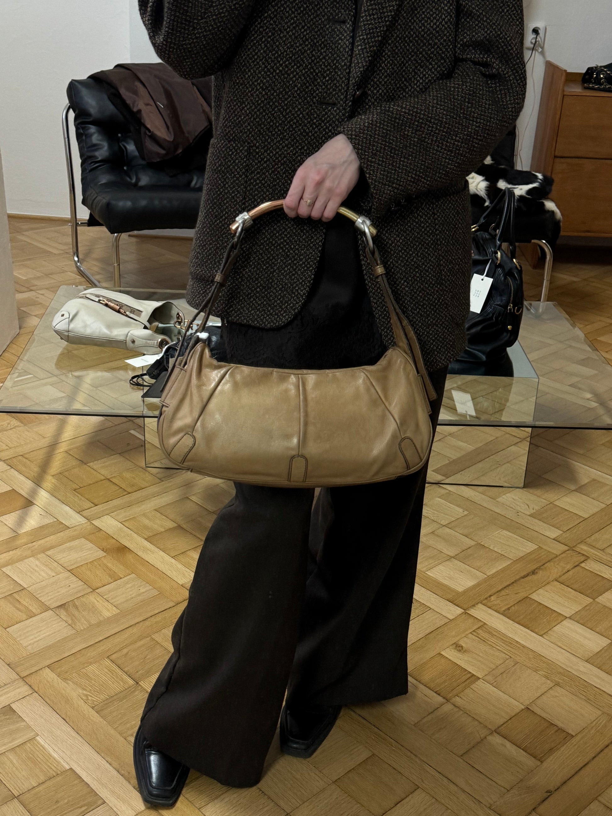Vintage Yves Saint Laurent Mombasa shoulder bag v trikolorním metalickém provedení v béžové barvě. Ikonická kabelka patří k nejvýraznějším modelům značky. Zajímavý a výrazný model ideální na denní nošení – praktická velikost pohodlně pojme všechny nezbytnosti a kabelka tak funguje jako stylový, ale přirozený doplněk každodenních outfitů.